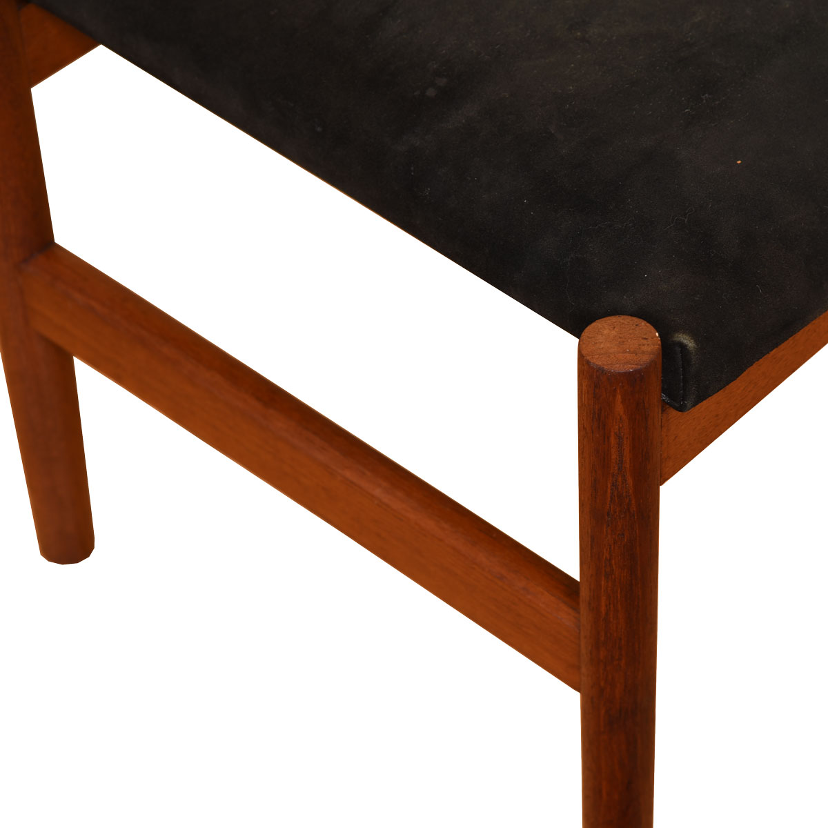 The frame, with tallish turned legs and stretcher bars on the ends, is teak. The tops of the legs cradle the seat at its four corners so the seat appears to float. It is covered in soft, black suede. This small piece makes a big statement and will pair nicely with many styles of chair.