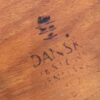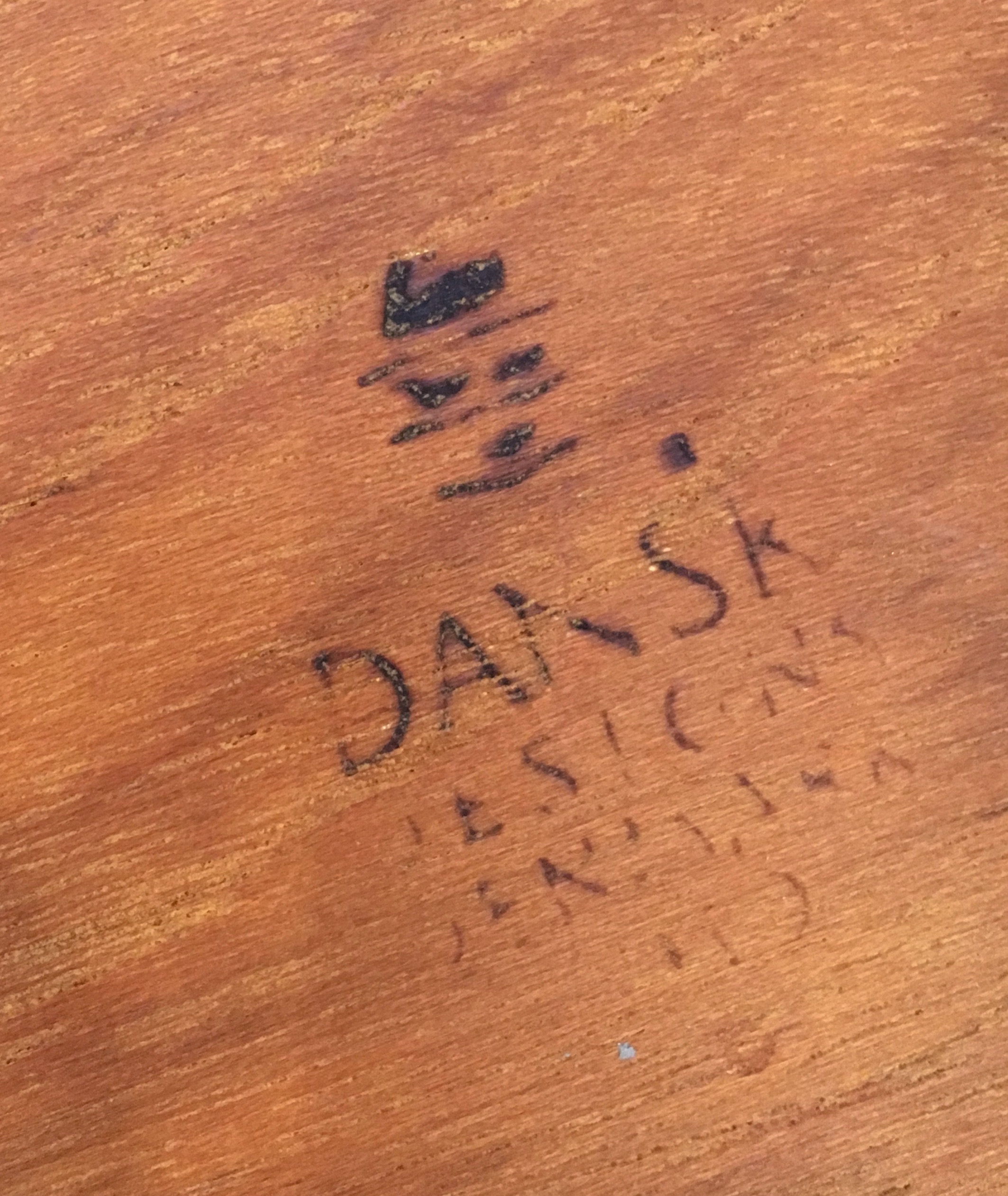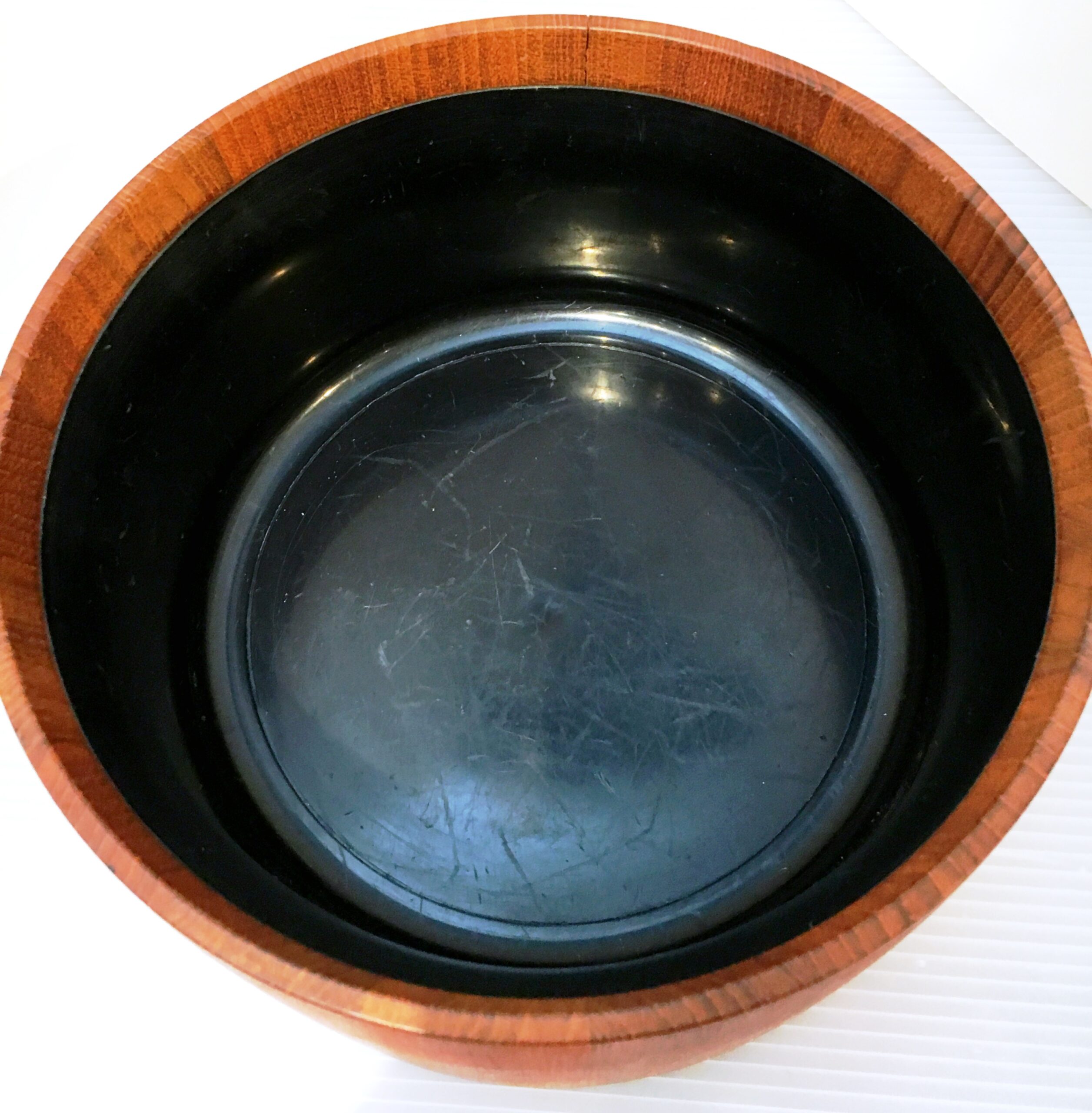 Very gracious design to this older Dansk Ice Bucket crafted of teak. It is round with a lid that tucks over the sides. The lid has a raised Circular Handle. The bucket is lined in black plastic. This baby has seen some parties – there is some scraping on the bottom but it will not affect the ability to hold Ice, and the exterior is in great condition.