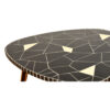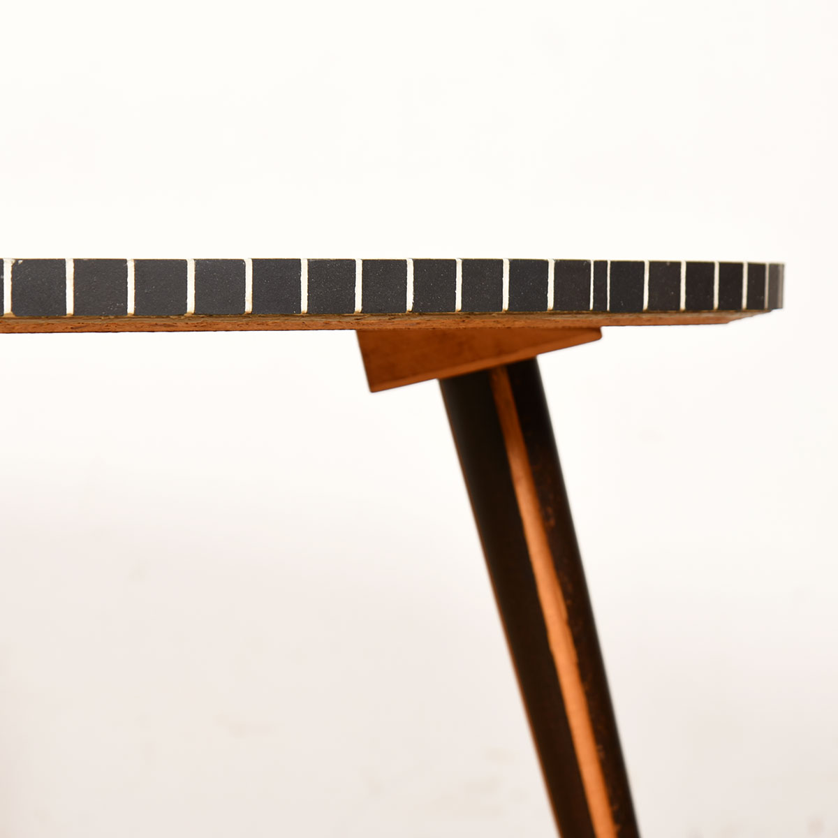 - A predominantly black and white mosaic has been crafted on the top, with 3 white triangles denoting the 3 side of the traingular shaped table with white form in the center