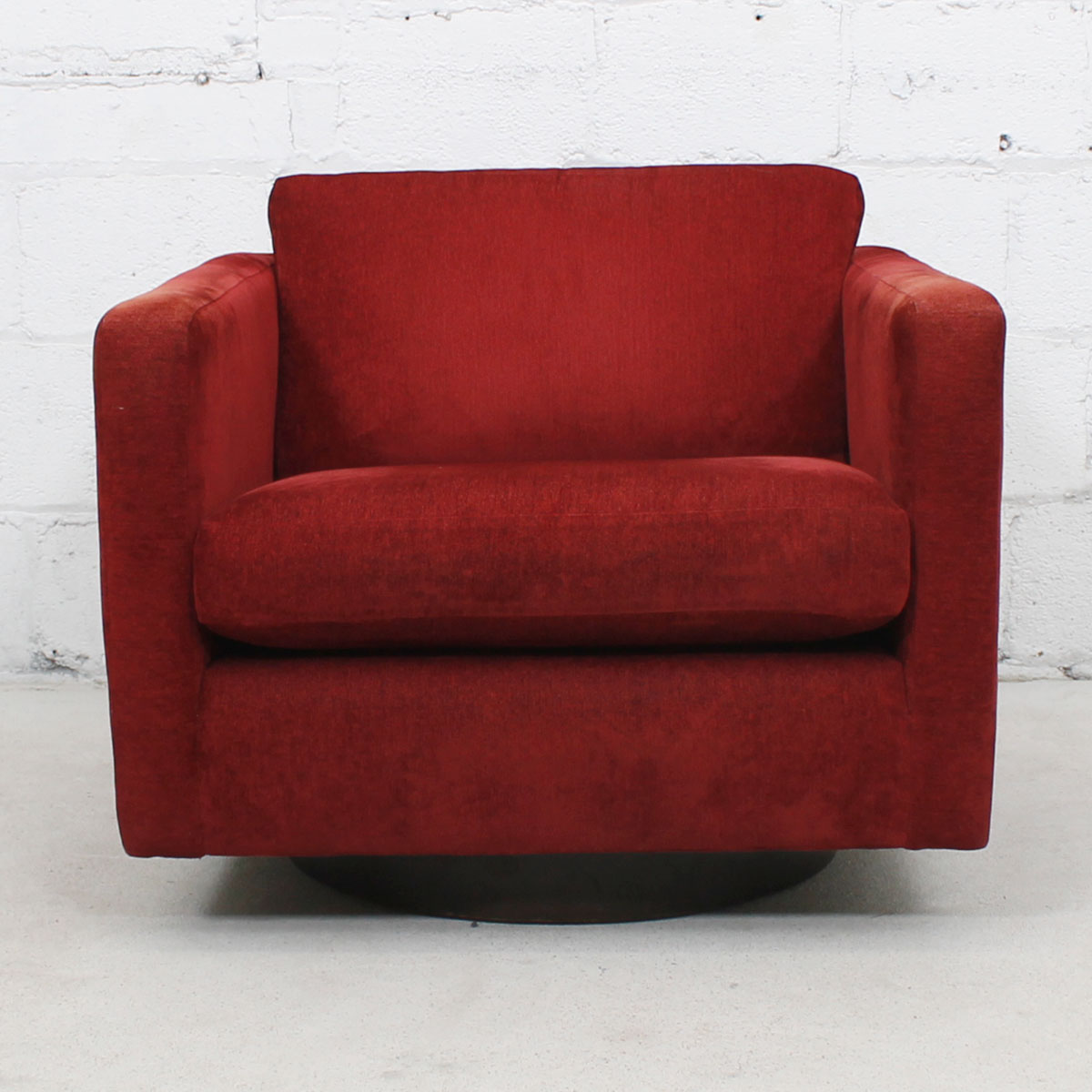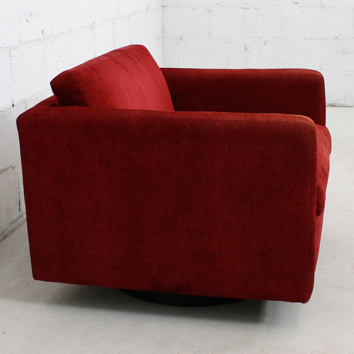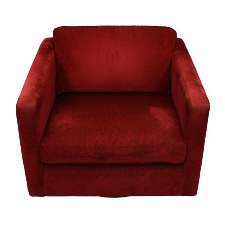 This mid-century modern styled chair invites you to sit down and get comfortable! Box-styled, it is upholstered all over in plush, crimson-colored upholstery. Best of all, it swivels!