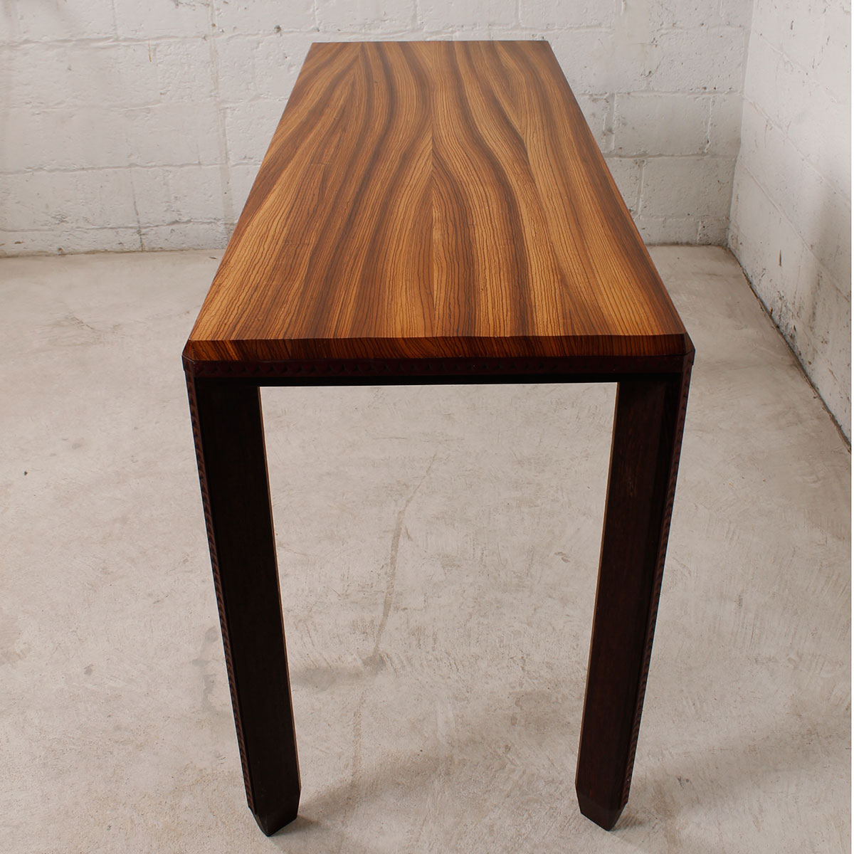 Magnificent custom / studio piece. Large console table with intricate, yet modern carved legs. The hue of the dark brown legs complement the dark striations in the exotic wood on the table’s surface, believed to be Zebra wood. This is an extremely impressive piece both in appearance and in size. Could also serve well as a desk.