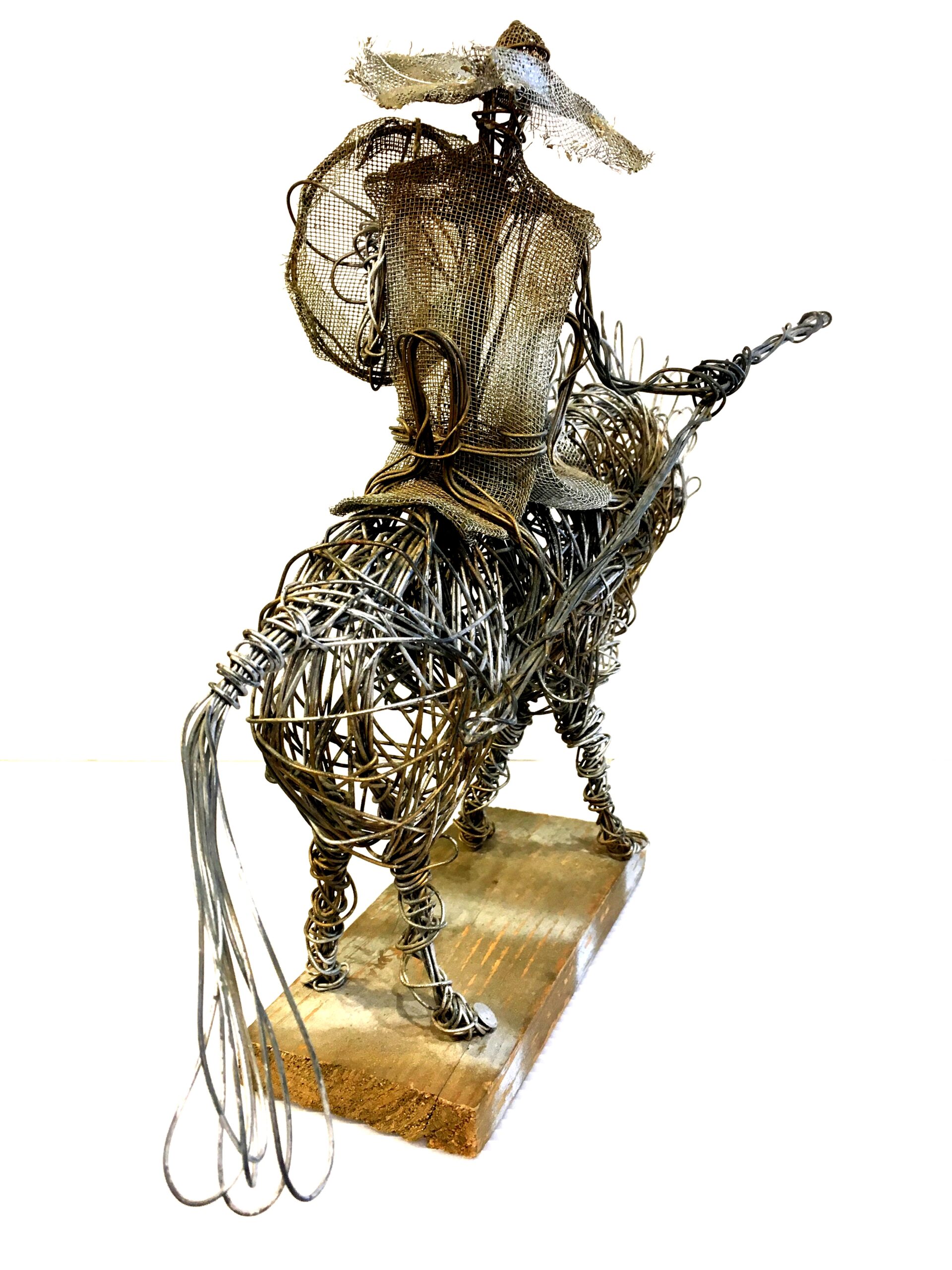 Very expressive wire sculpture of Don Quixote on his horse. Mounted on a wood base and signed by the artist.