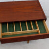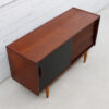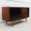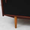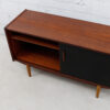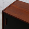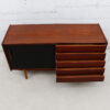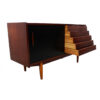 A refined design, the front is composed of two sides: the left side has a black laminate sliding door that opens to a cubby area with one adjustable shelf. The right side is composed of five louvered drawers, one of the hallmarks of the old Danish style.