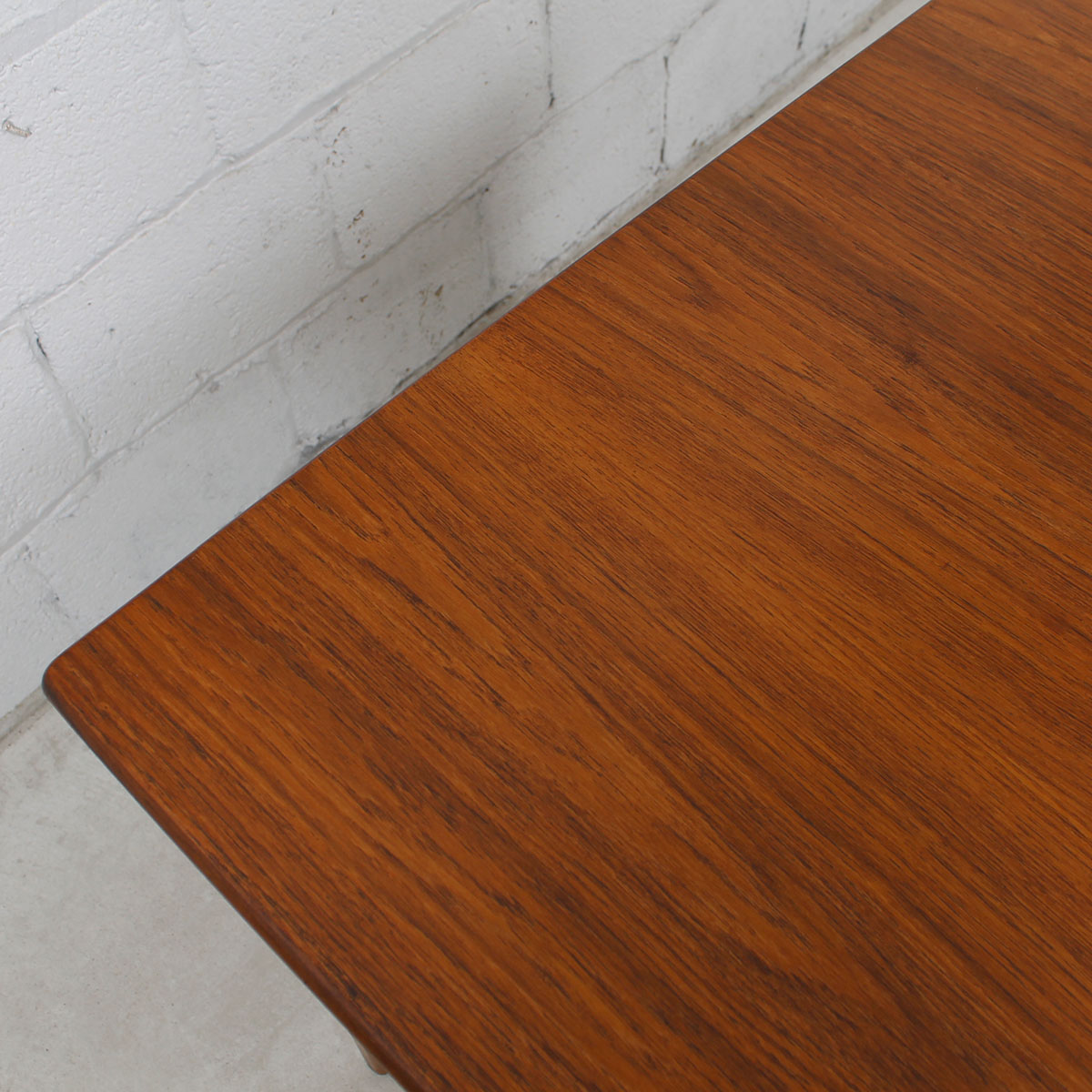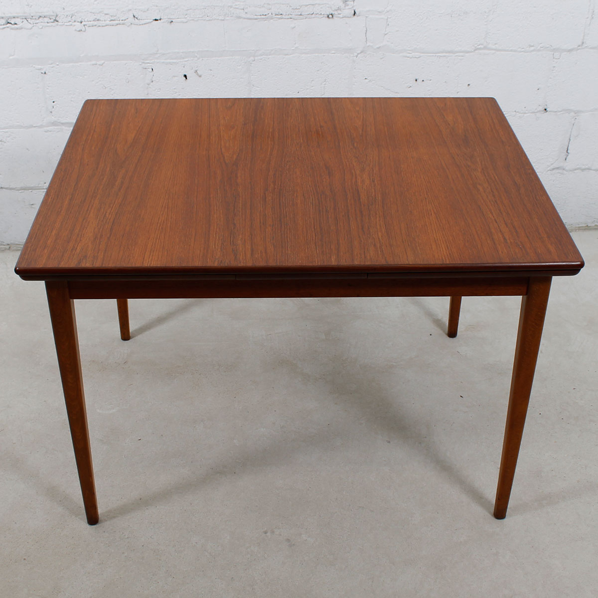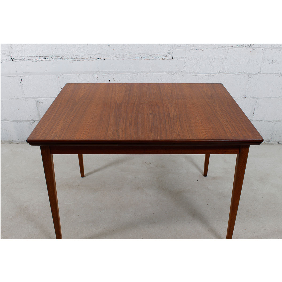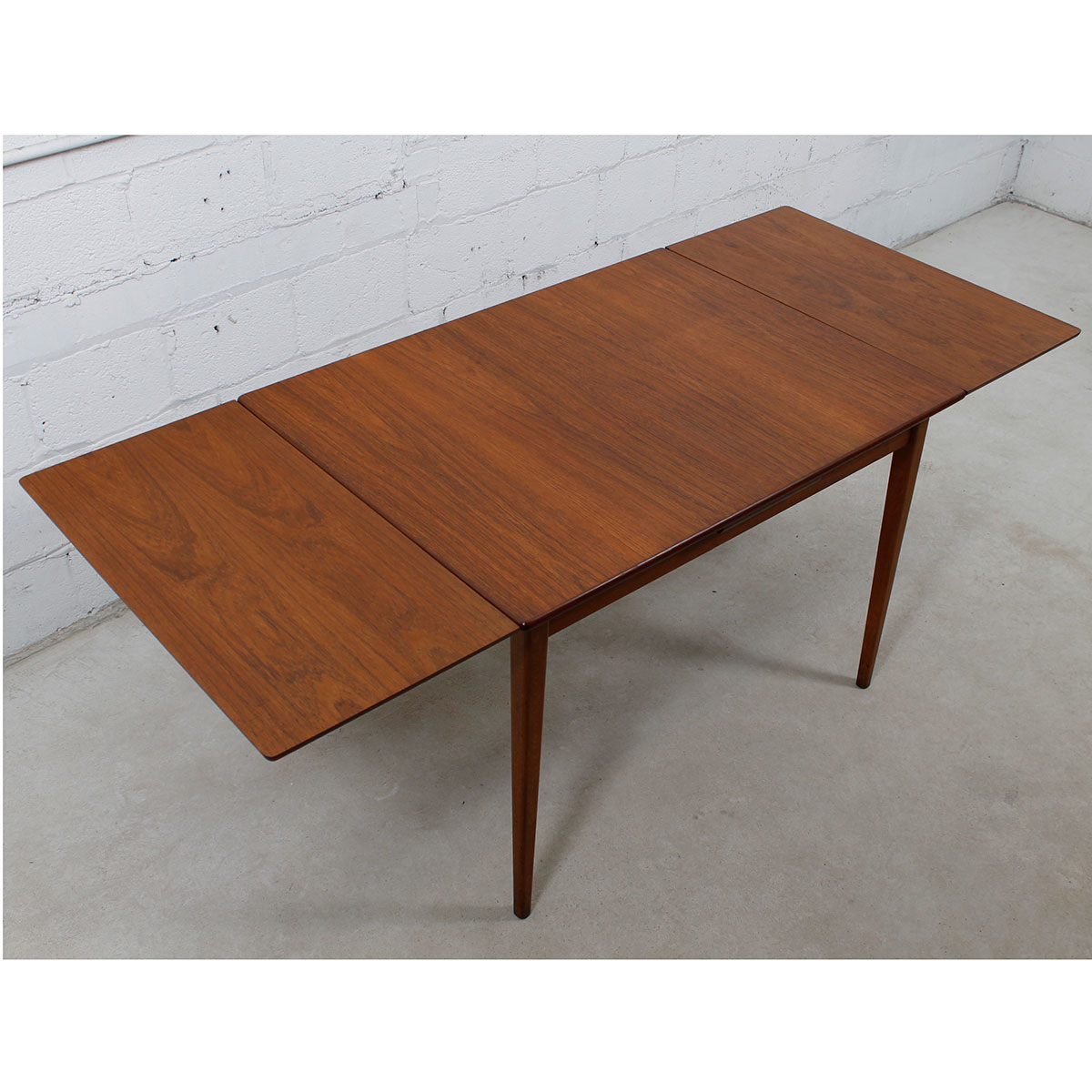 For your urban pied à terre or breakfast nook, here is a wonderful table in one of the smallest sizes we get occasionally, making it extremely desirable. Only 31″ across and 41.25″ wide it expands twice through leaves that pull out at either end. Its maximum length is 72.72, seating six people. The teak has aged nicely to a beautiful patina.