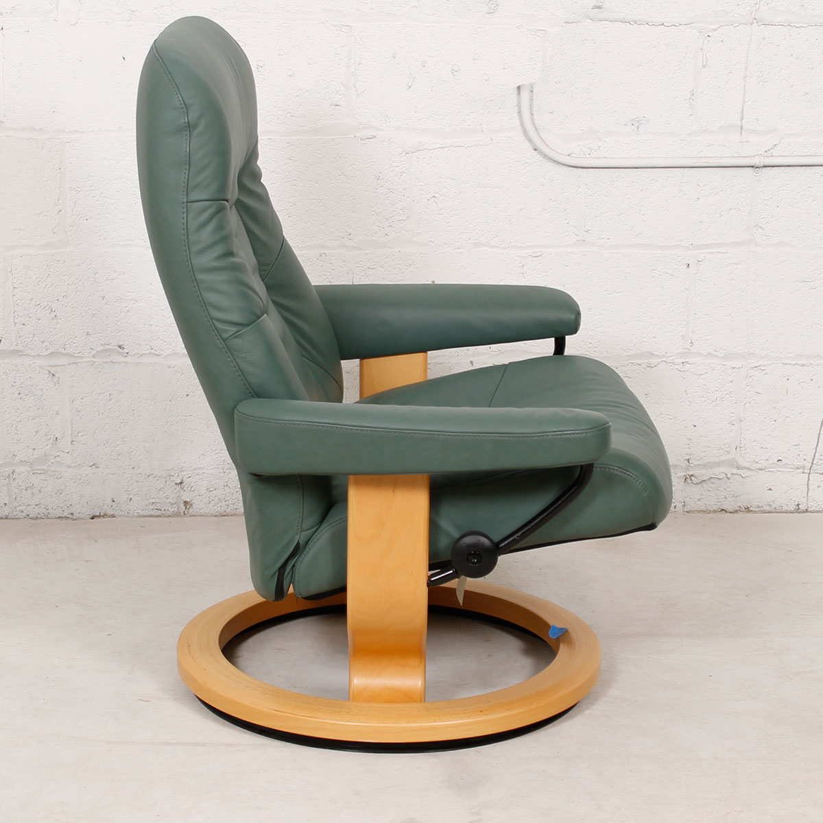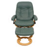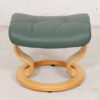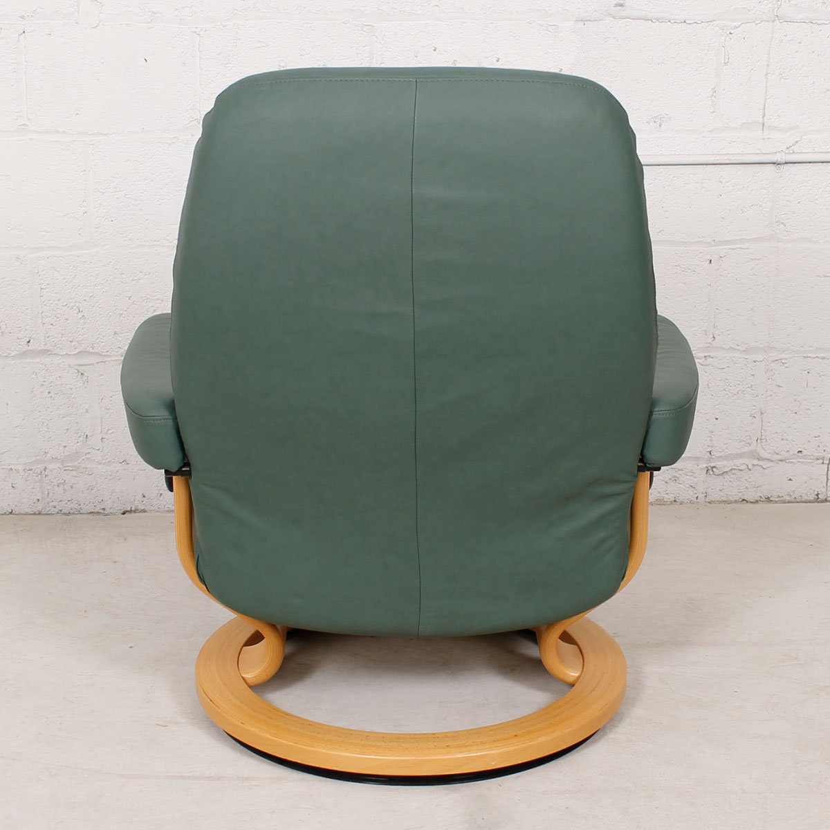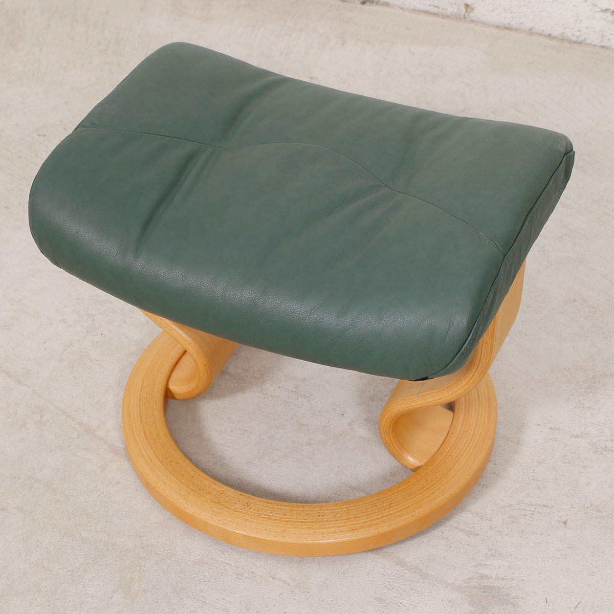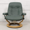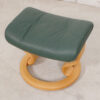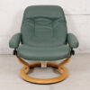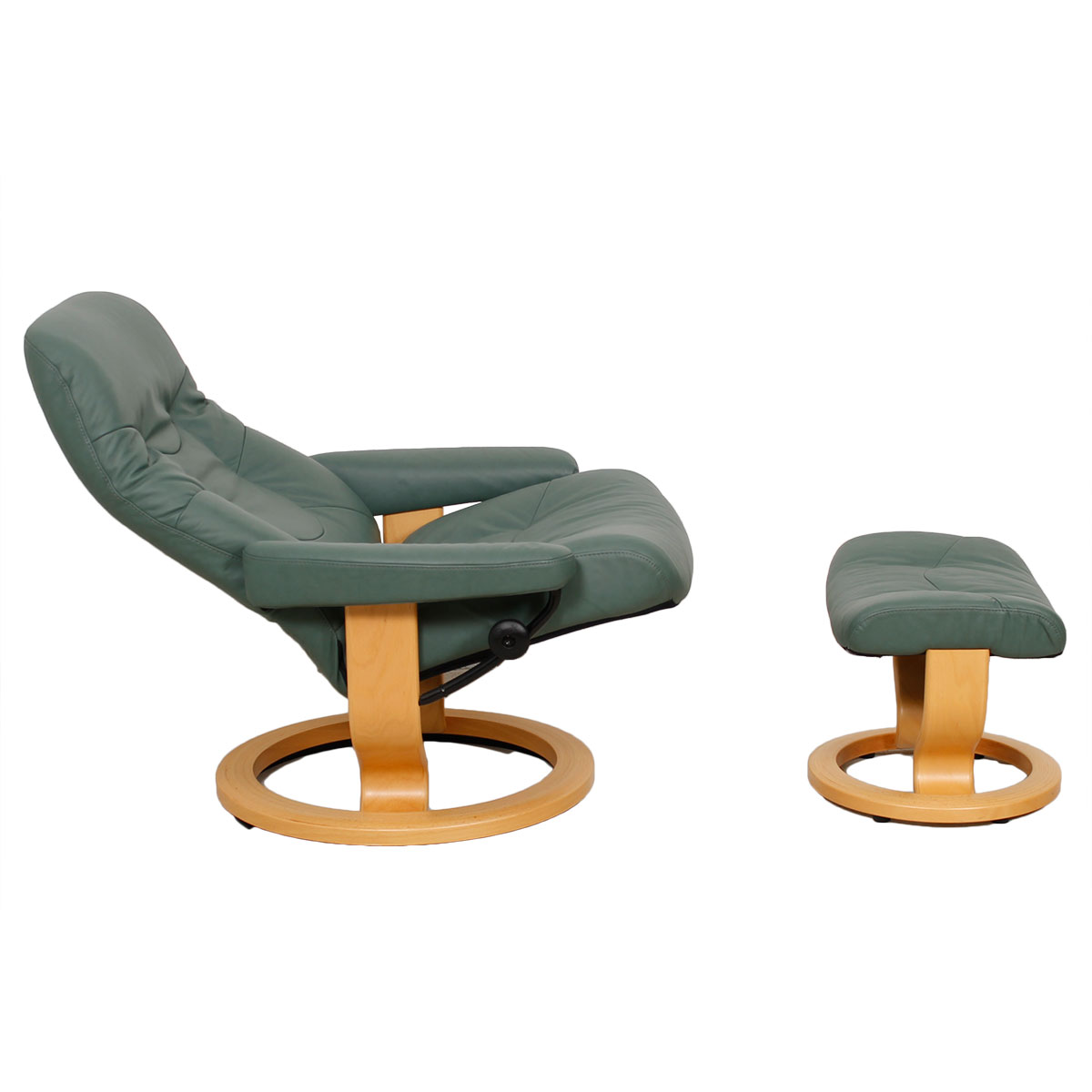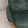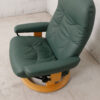 An Ekornes Norwegian stressless green leather lounge chair that reclines to an almost perfectly horizontal position for maximum relaxation. This chair is guaranteed to be the cause of absolutely zero productivity! Both the chair and ottoman are upholstered in green leather with wood bases. Simply a luxurious reclining chair where comfort is a given!