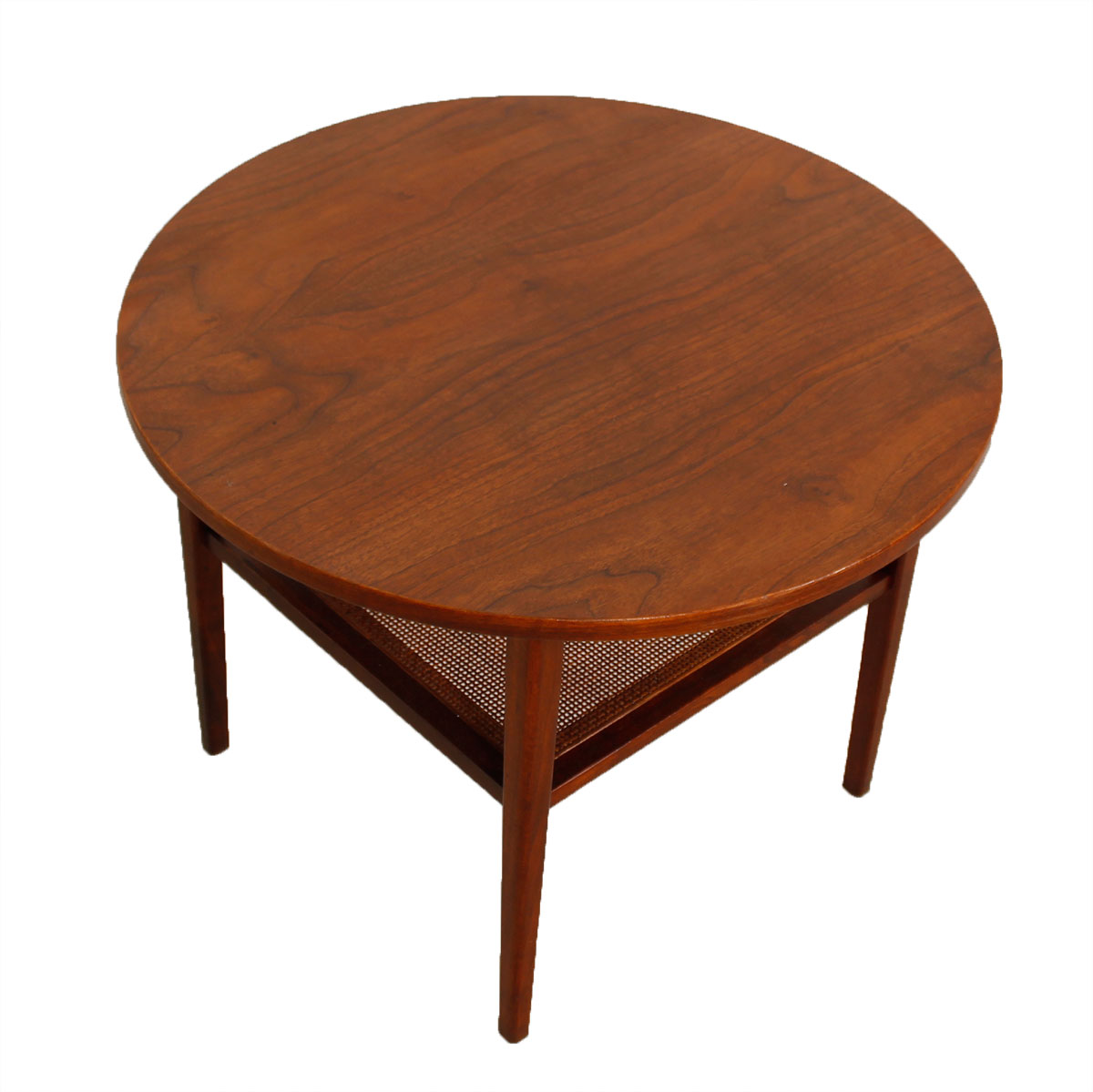 To complement your elegant décor, we are pleased to offer this 27″ walnut occasional / side table. Its functionality is doubled by the inclusion of a rattan shelf in the design. The walnut has aged to beautiful warm golden tones. This table – not too small, not too large – is a mid century beauty and will fit into many rooms due to its classic styling and wonderful size.