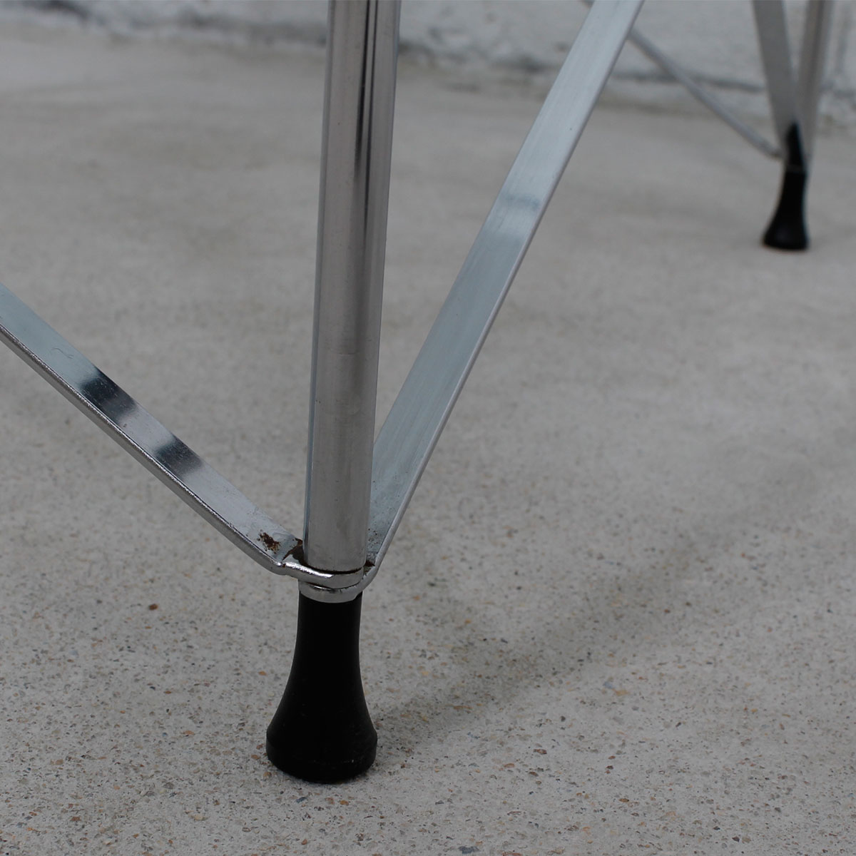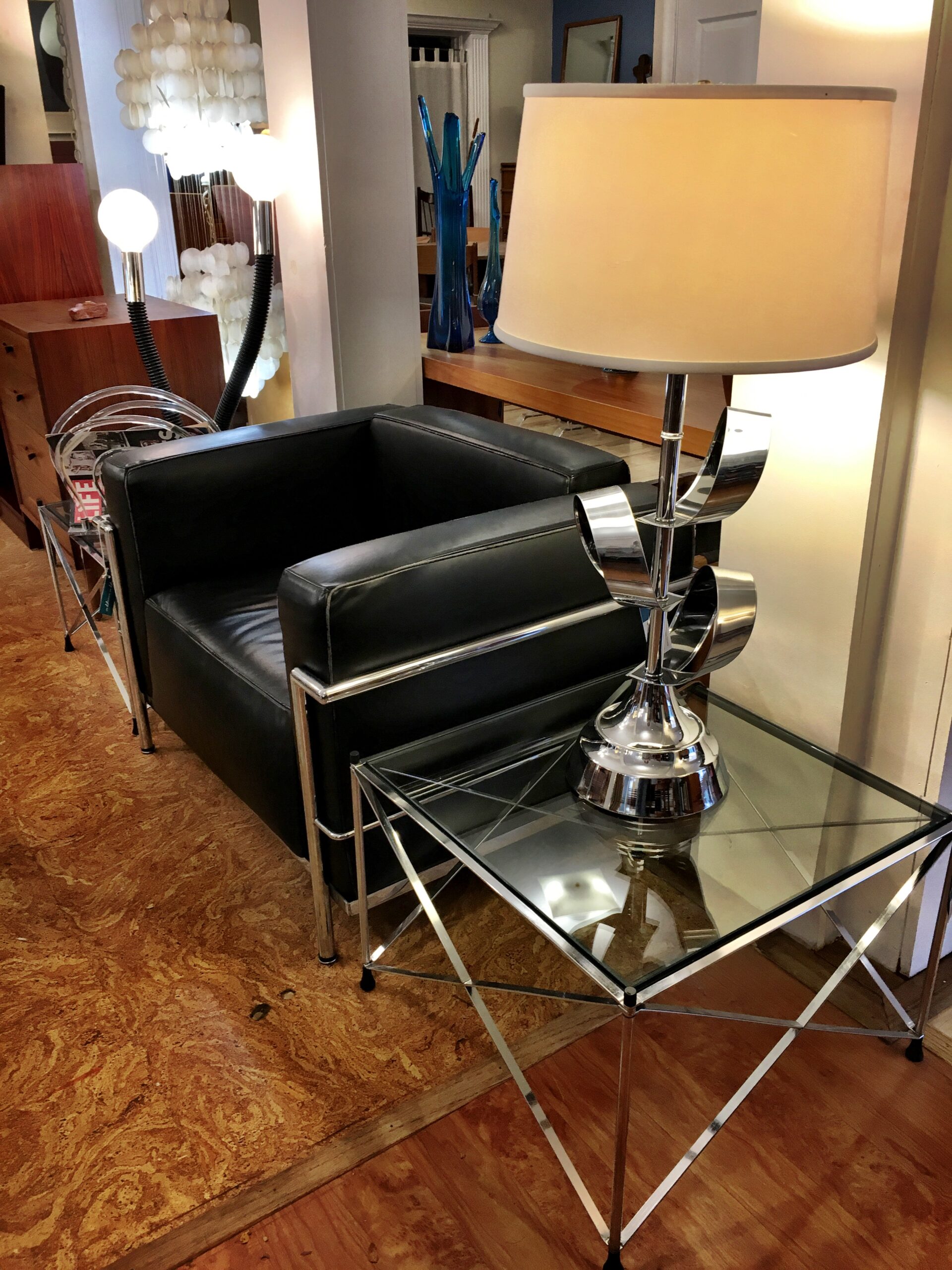 This is an arresting pair of chrome and glass vintage side tables with interesting details that make you stop to look closer. Each leg forms the corners of the table and a chrome “X” stretches across each side giving the table a quiet presence. The top and bottom of each leg is capped in black, contrasting subtly with the chrome and glass top. These tables have potential in many settings – industrial, contemporary, asian-inspired to name just a few.