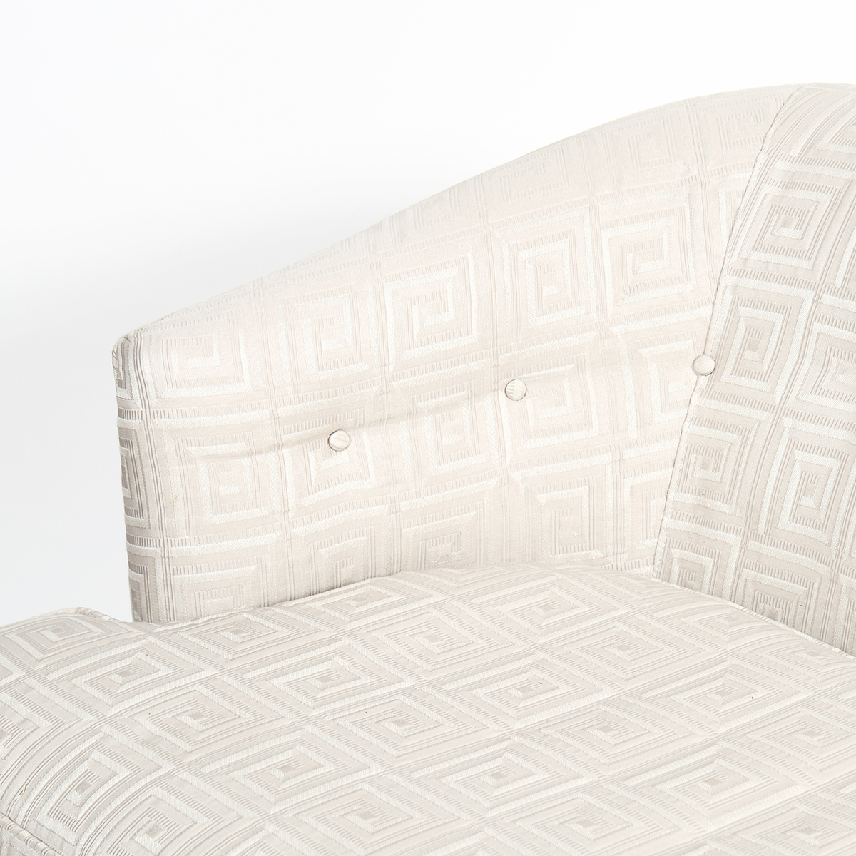- Covered in pearl gray brocade with a Greek key jacquard pattern