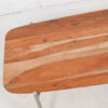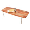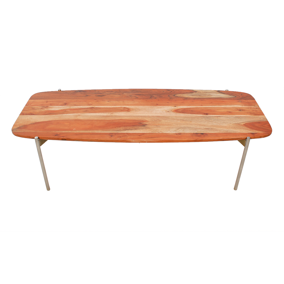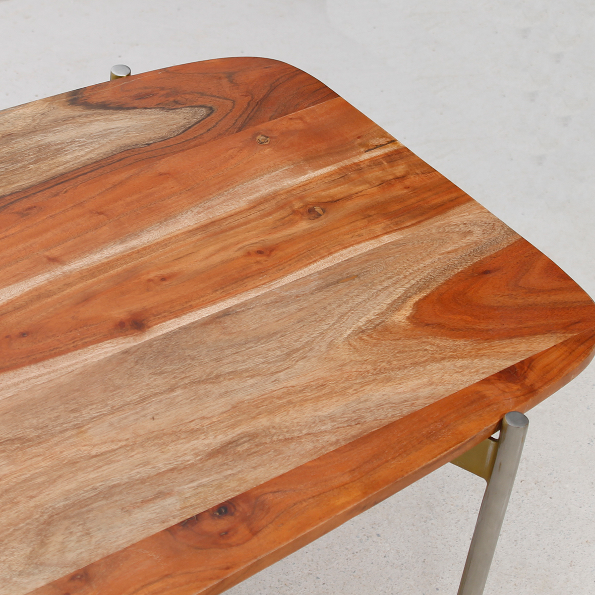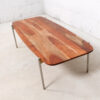 The top is an interesting rectangle of wood that is supported by steel legs. The round top of each of the four legs is visible. The grain on the table is bold, and there are tones ranging from sepia to blonde. The table has a great vibe that would work well in a modern, industrial or even a rustic decor.