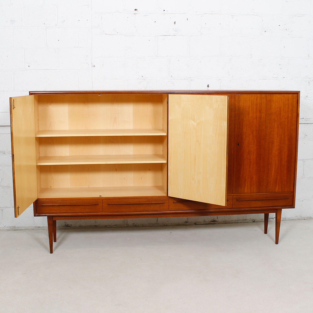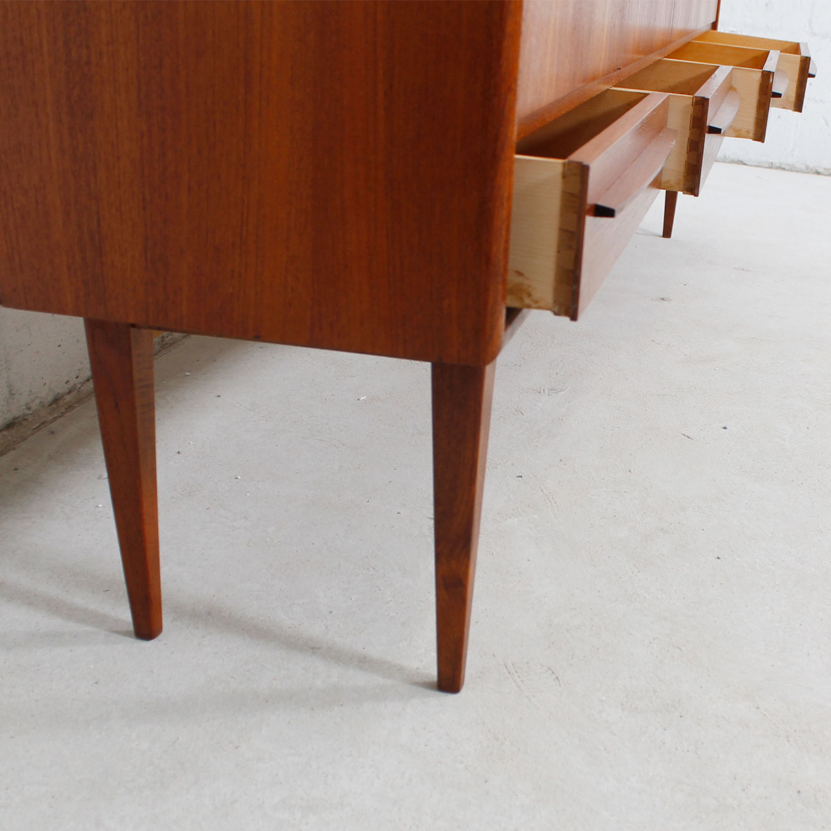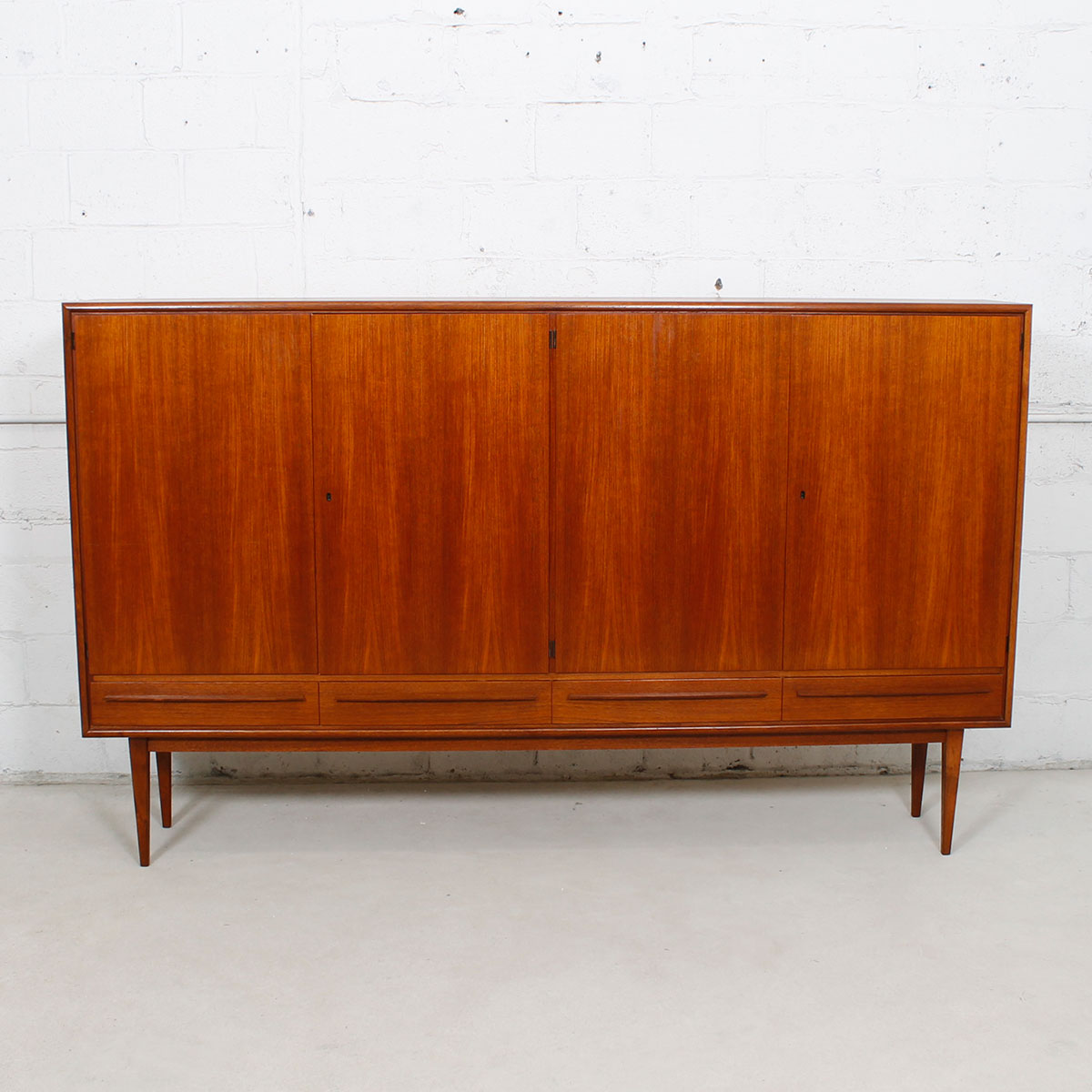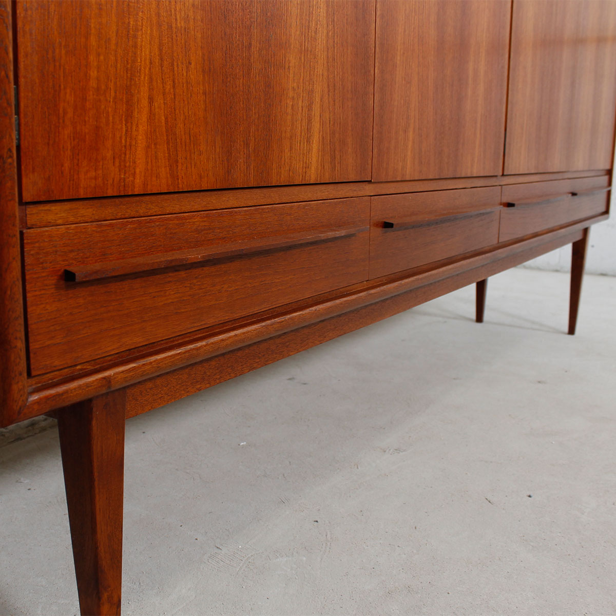 With such a simple design, the wood becomes the focus on this impressive piece. The teak has aged to a gorgeous rich color and the placement of the graining enhances the overall presence of this highboard. Use it to store household goods in the dining room, as a bar cabinet in the living room, for books and albums in the library or family room — its potential usage is unlimited!