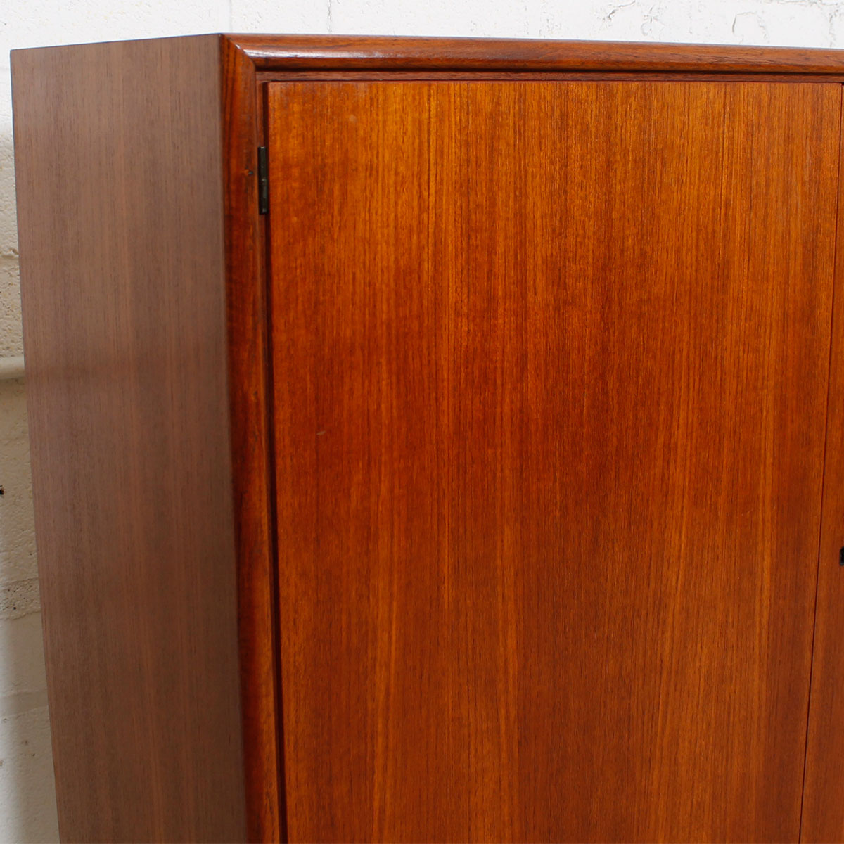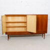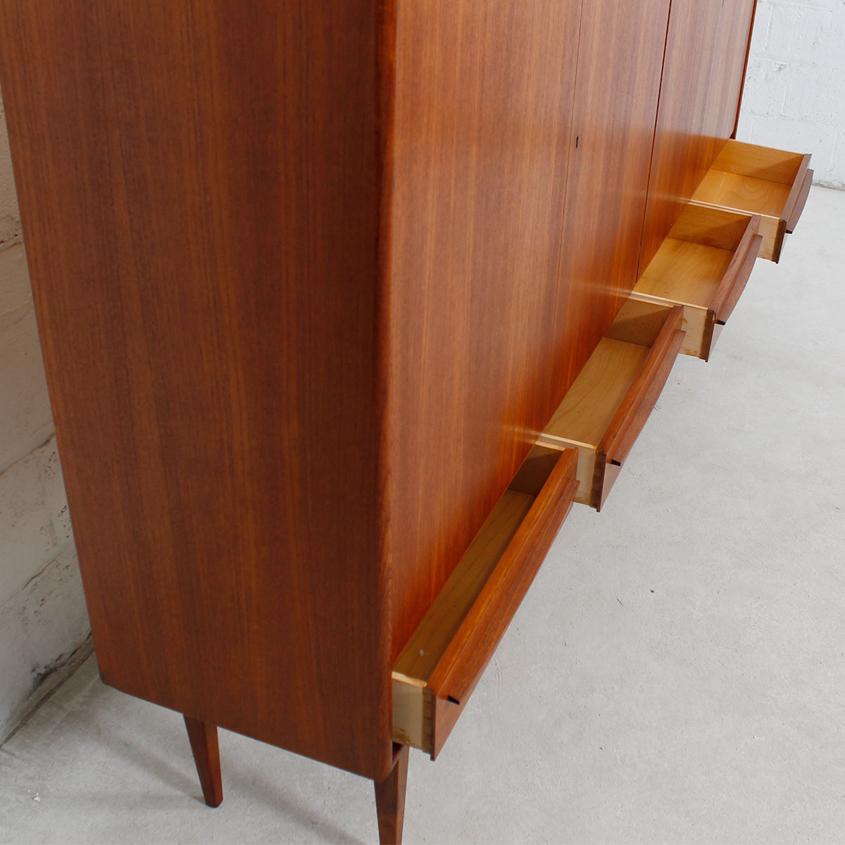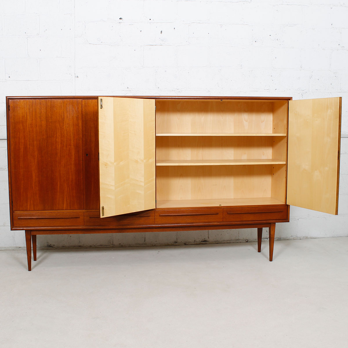 With such a simple design, the wood becomes the focus on this impressive piece. The teak has aged to a gorgeous rich color and the placement of the graining enhances the overall presence of this highboard. Use it to store household goods in the dining room, as a bar cabinet in the living room, for books and albums in the library or family room — its potential usage is unlimited!