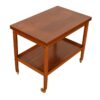 The top on this old bar cart slides and folds open to double the surface of the table top. A shelf below provides additional functionality. The teak has aged to deep perfection and the old wheels roll smoothly. Use this lovely piece as an occasional table or for serving. A marriage of beauty and function.