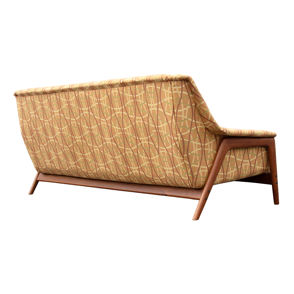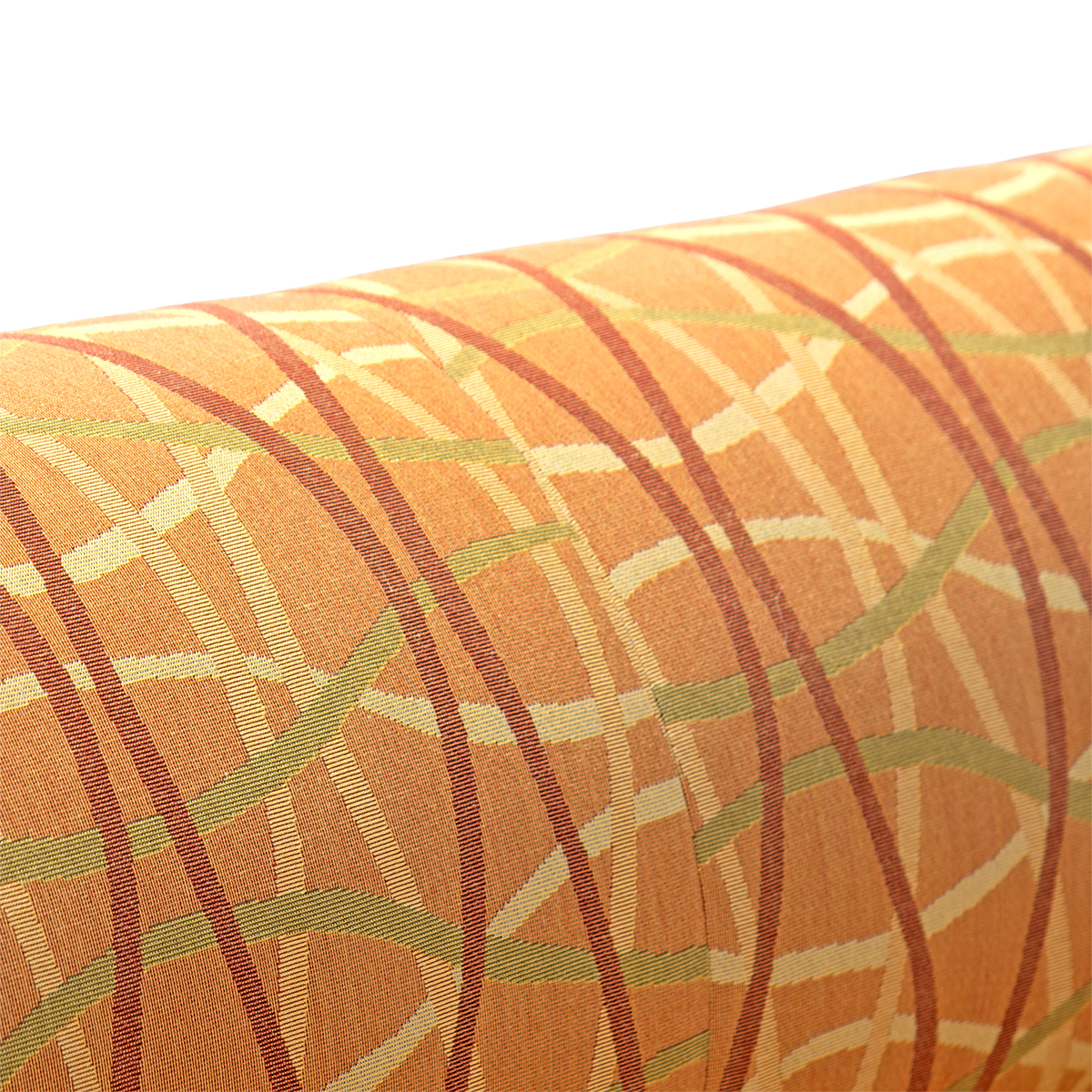 - Reupholstered in a modernist fabric with a mustard background and touches of rust, beige, and spring green