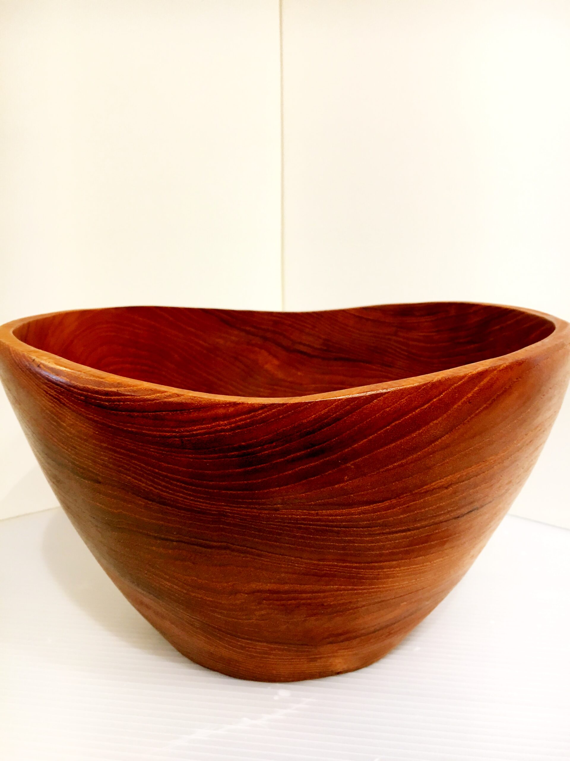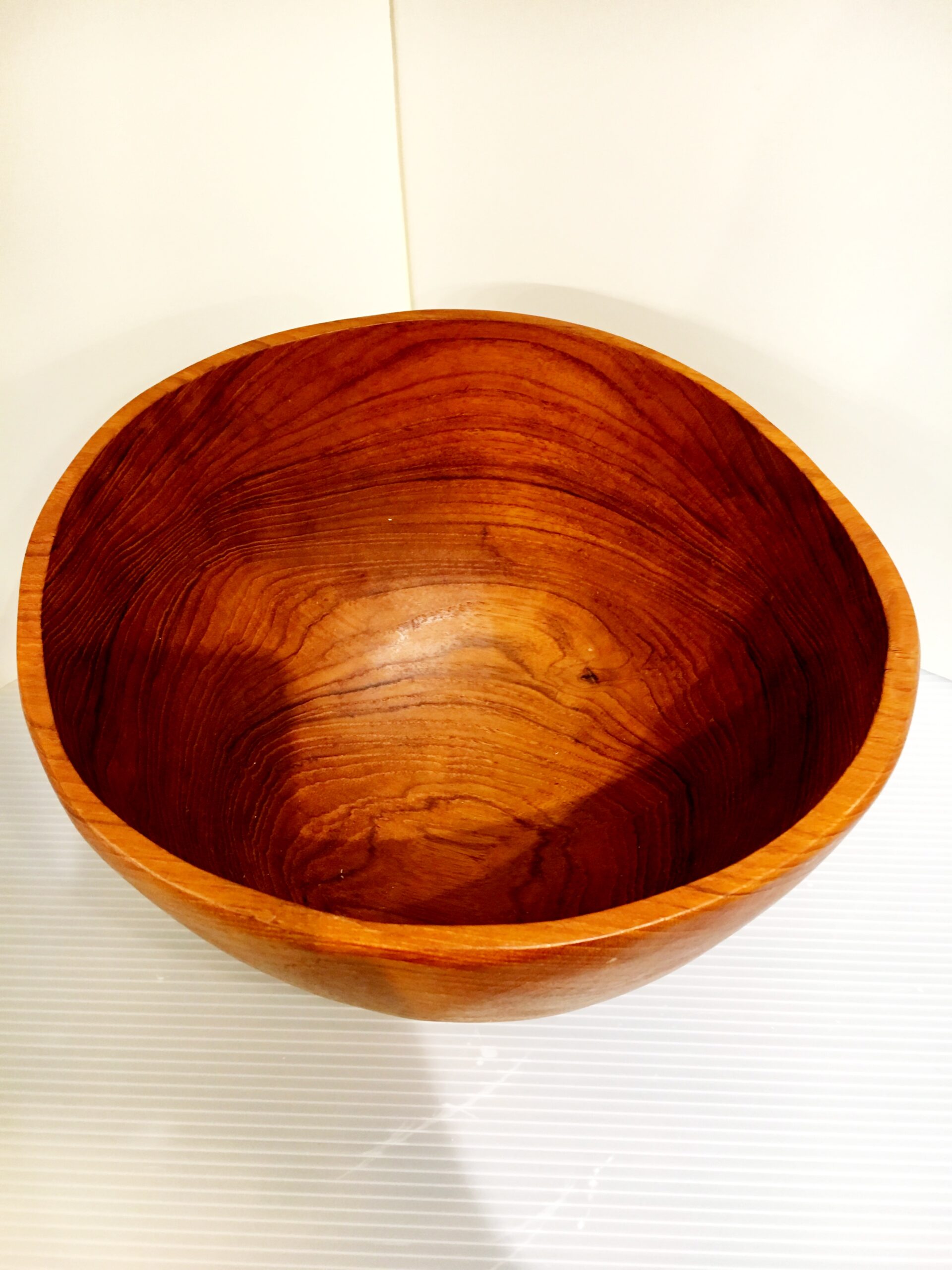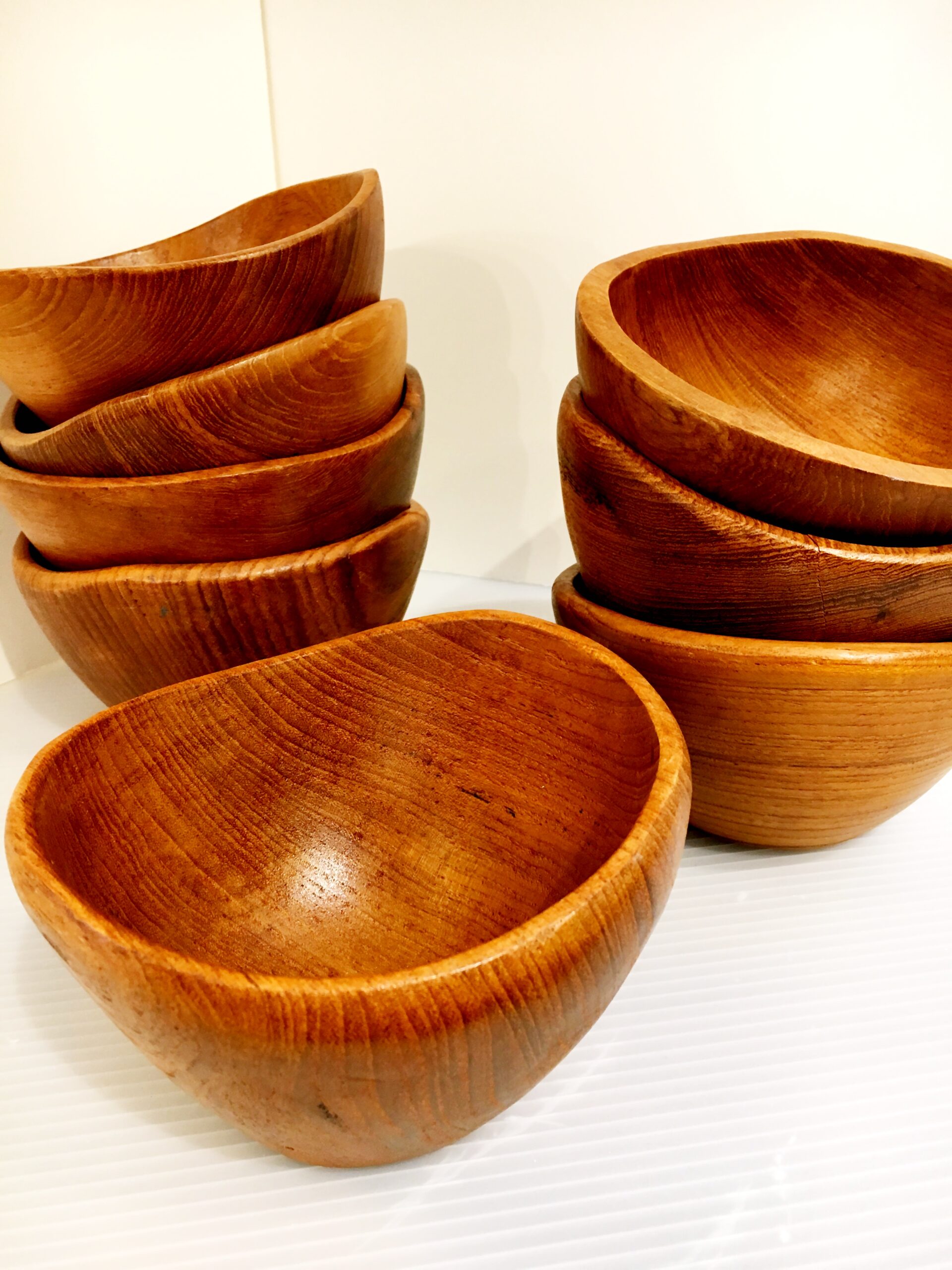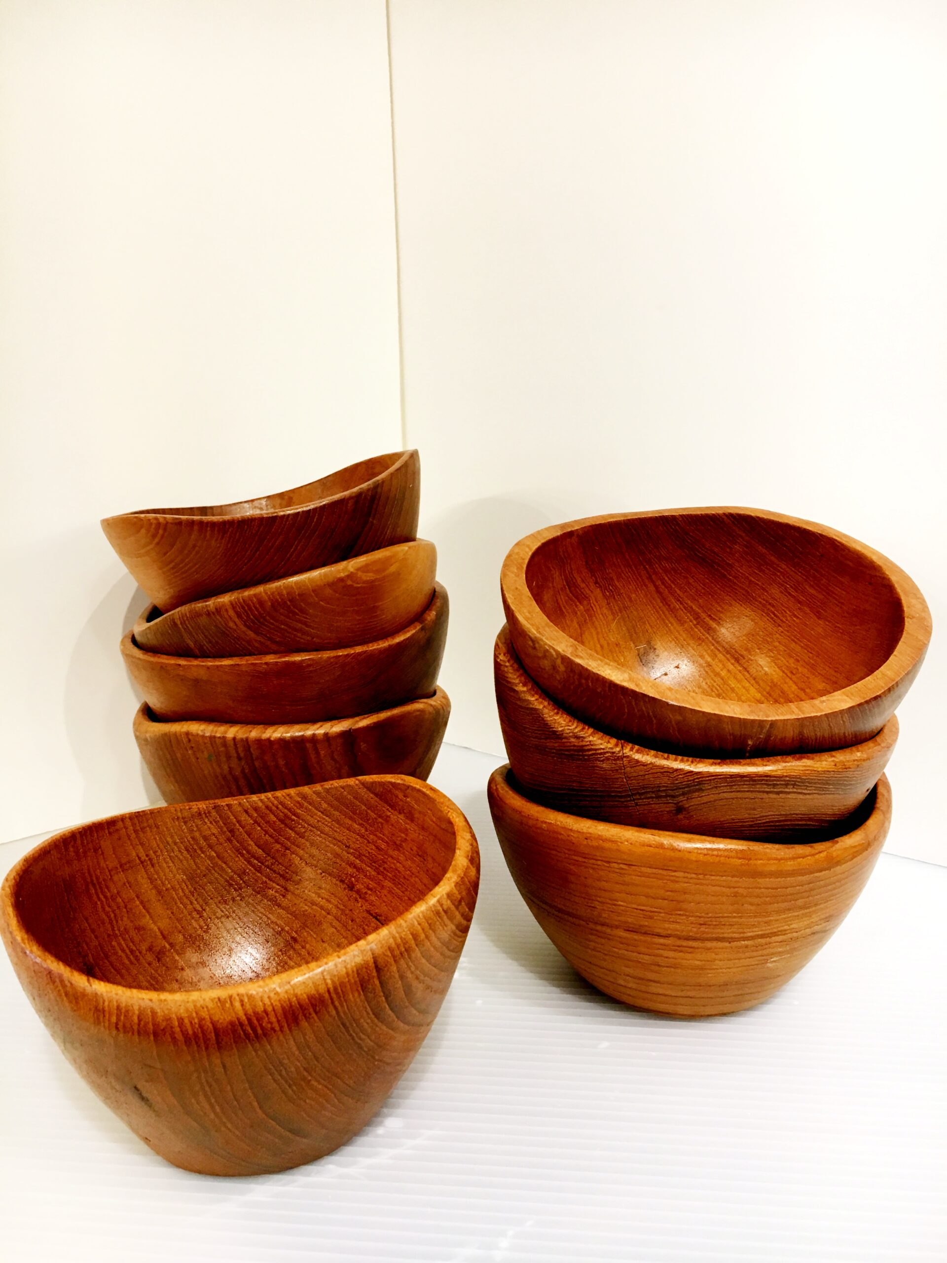 One piece of teak was used to form the large salad bowl, which is extremely pleasing in its shape and the graining of the wood. The bowl widens as it gets larger and the top edge is free form. There are also eight small matching serving bowls.