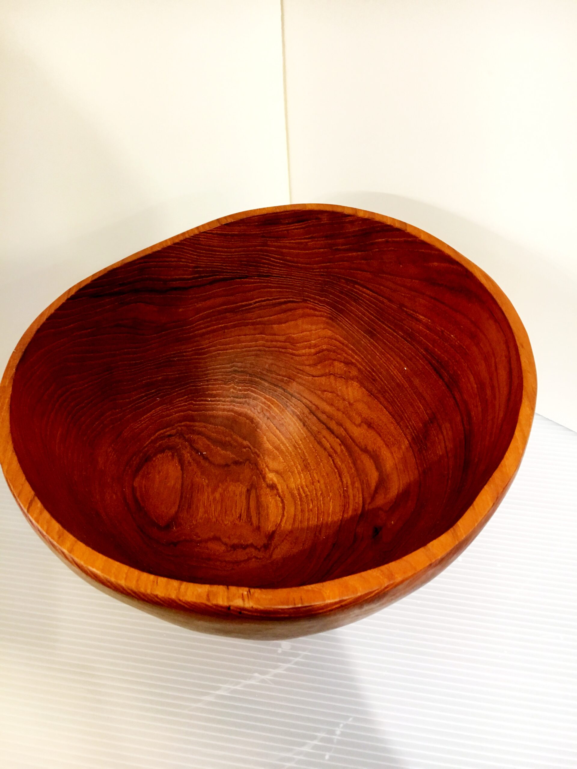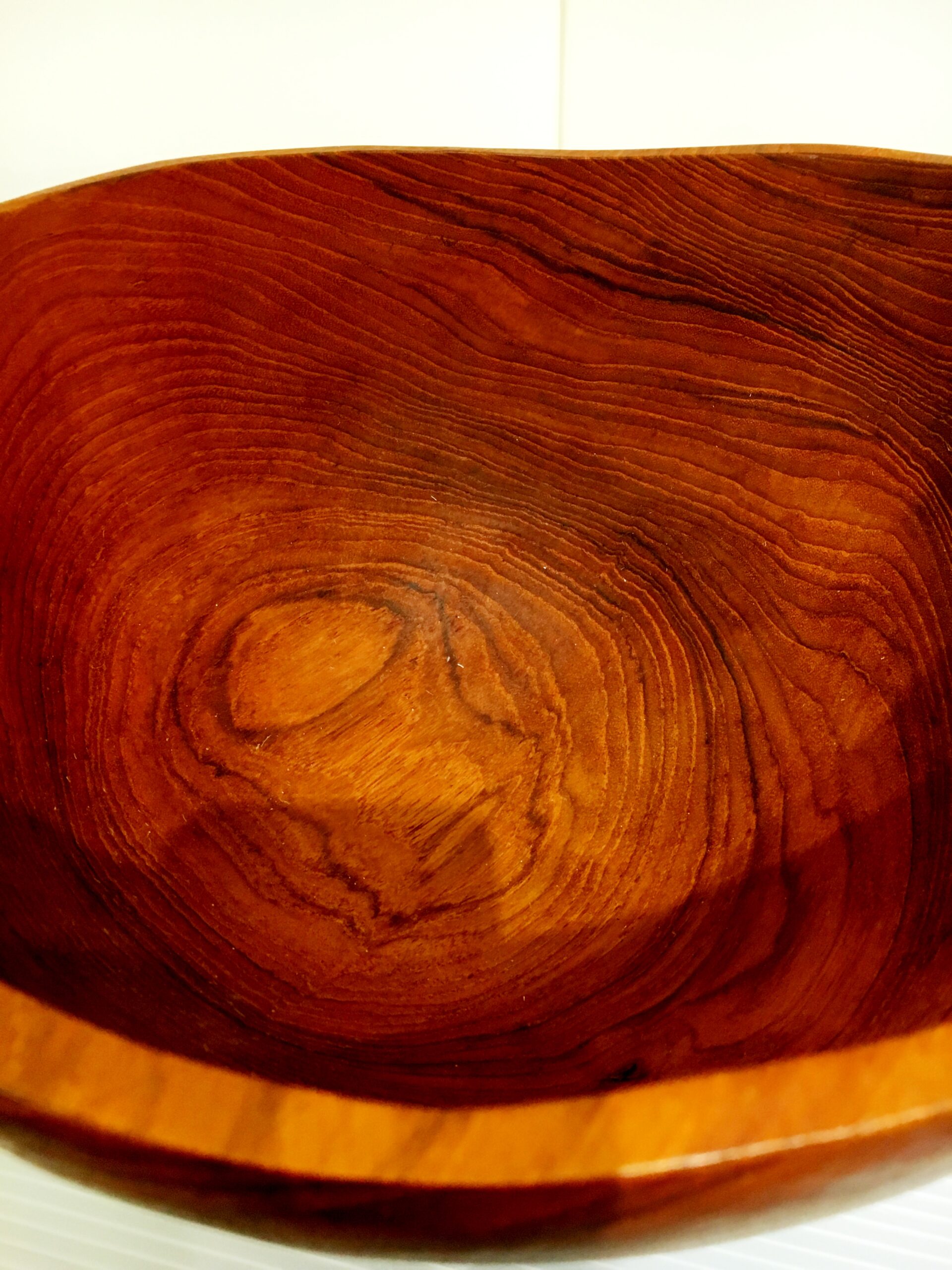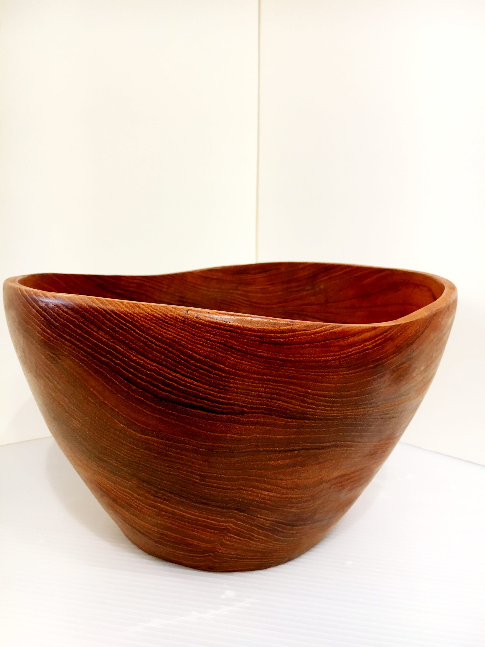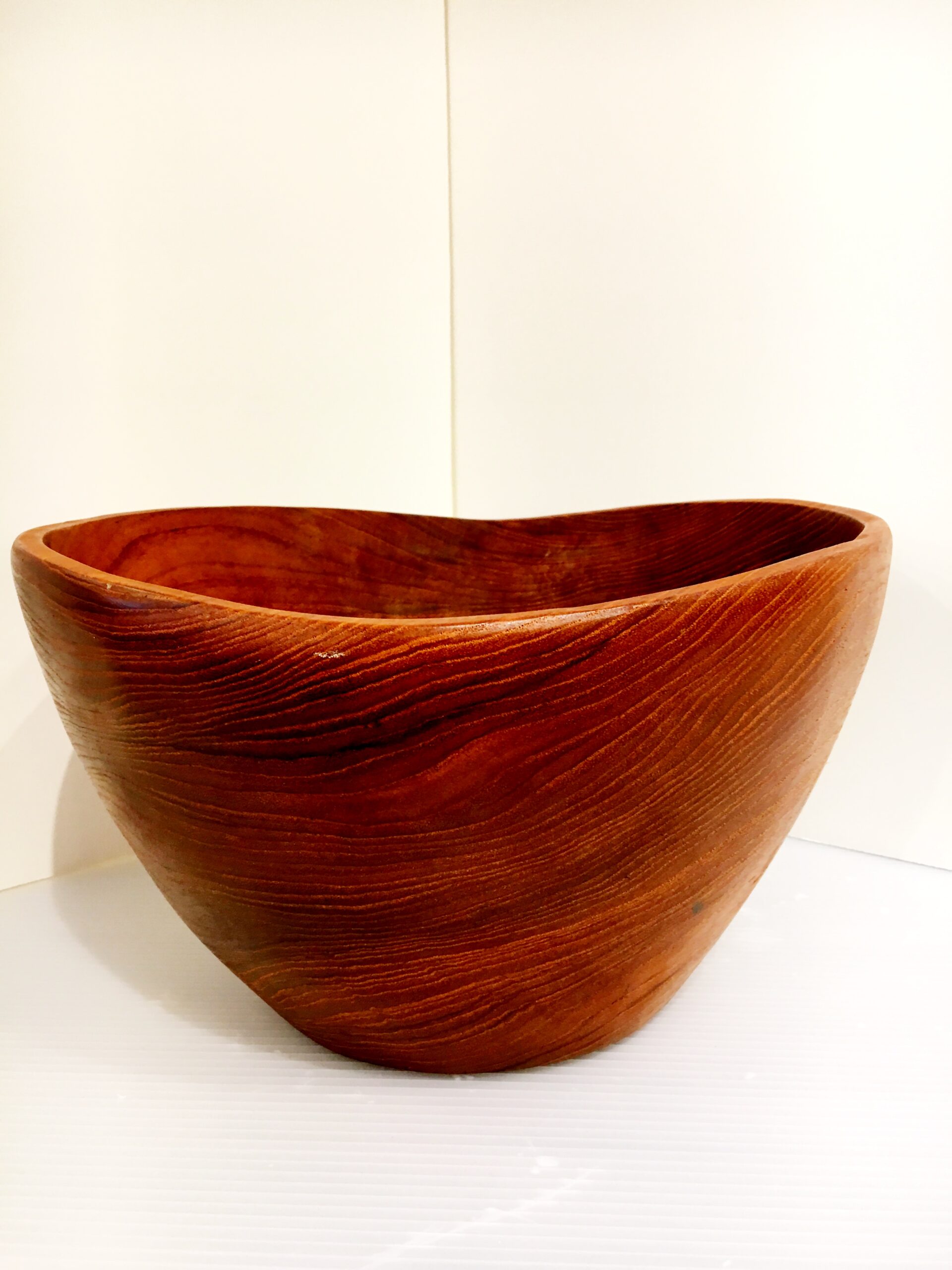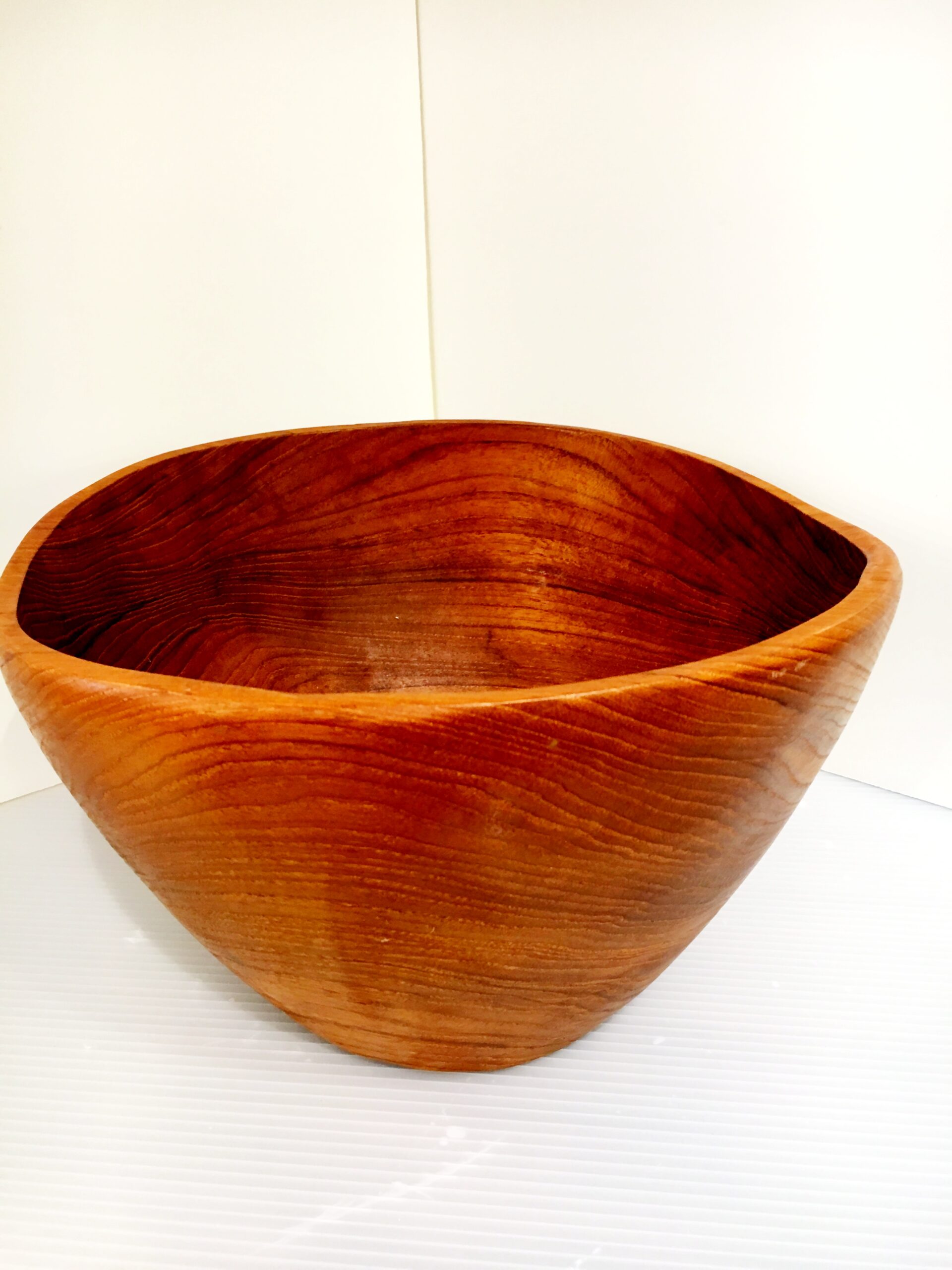 One piece of teak was used to form the large salad bowl, which is extremely pleasing in its shape and the graining of the wood. The bowl widens as it gets larger and the top edge is free form. There are also eight small matching serving bowls.