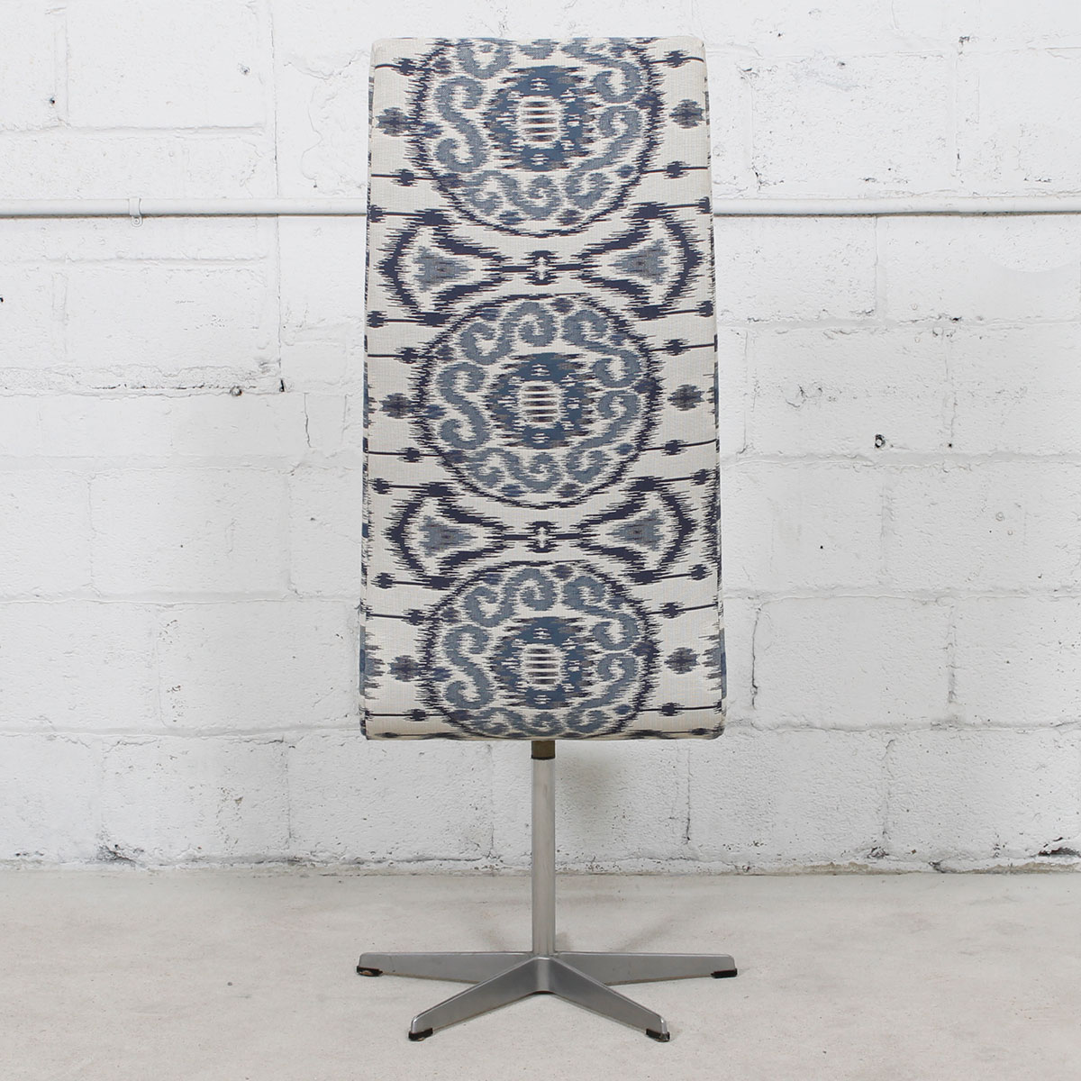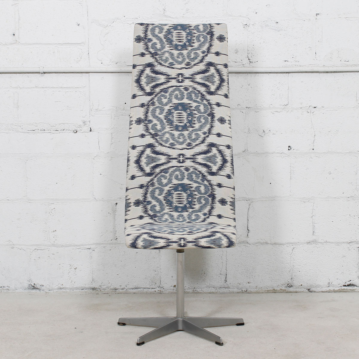 We are extremely proud to offer this stunning (early production) set of six high back chairs by Arne Jacobsen for Fritz Hansen, Denmark. Thanks to thoughtful Danish design, they are extremely comfortable due to the support the lower body receives from the gentle curve of the back. The seat of each chair is fully upholstered and sits on a steel rod terminating in a five-point base. The remarkable thing about this set is the beautiful blue and white Ikat upholstery. The chairs were recently recovered with the pattern being perfectly placed on the front and on the back for maximum dramatic effect. To see them all together is truly magnificent.