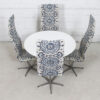 Paired with a glass top or lucite table, the fabric would be showcased to its full advantage, although this set would also be fantastic with a white tulip style table. If you are furnishing a conference room and want to make a statement outside the usual dreary office furniture, these would be the perfect choice. Or, scatter these chairs around a large room or home as accent pieces. A remarkable find!