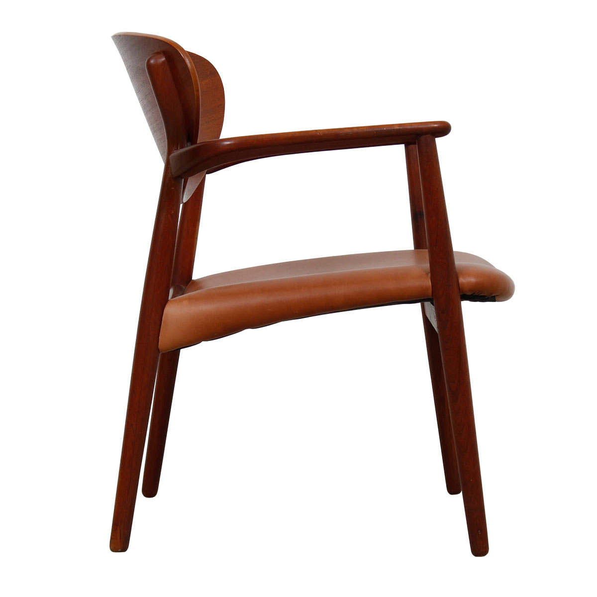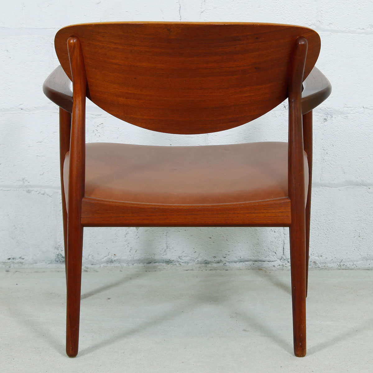 It was imported by the Georg Jensen store in New York in 1965. The sturdy frame has beautiful lines, especially in the way the arms are formed. The seat, upholstered in cognac-colored leather, is angled for comfort. Comfortable, durable and stylish in the best of the Danish tradition.