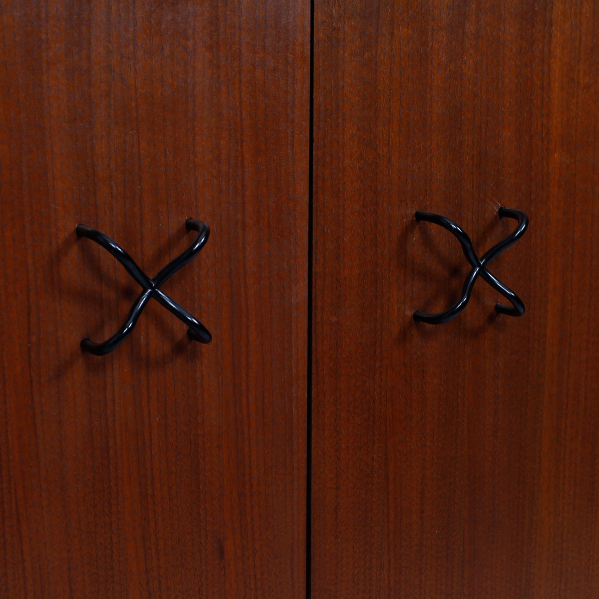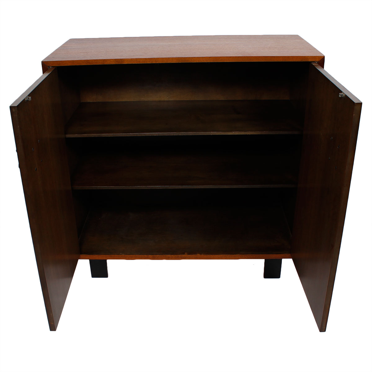 A wonderful compact cabinet by George Nelson for Herman Miller in a deep rich toned Walnut. From the Nelson Basic Cabinet Series, designed in 1946, this is a rare configuration of the black-finished X-form steel pulls matching the black solid-wood legs!