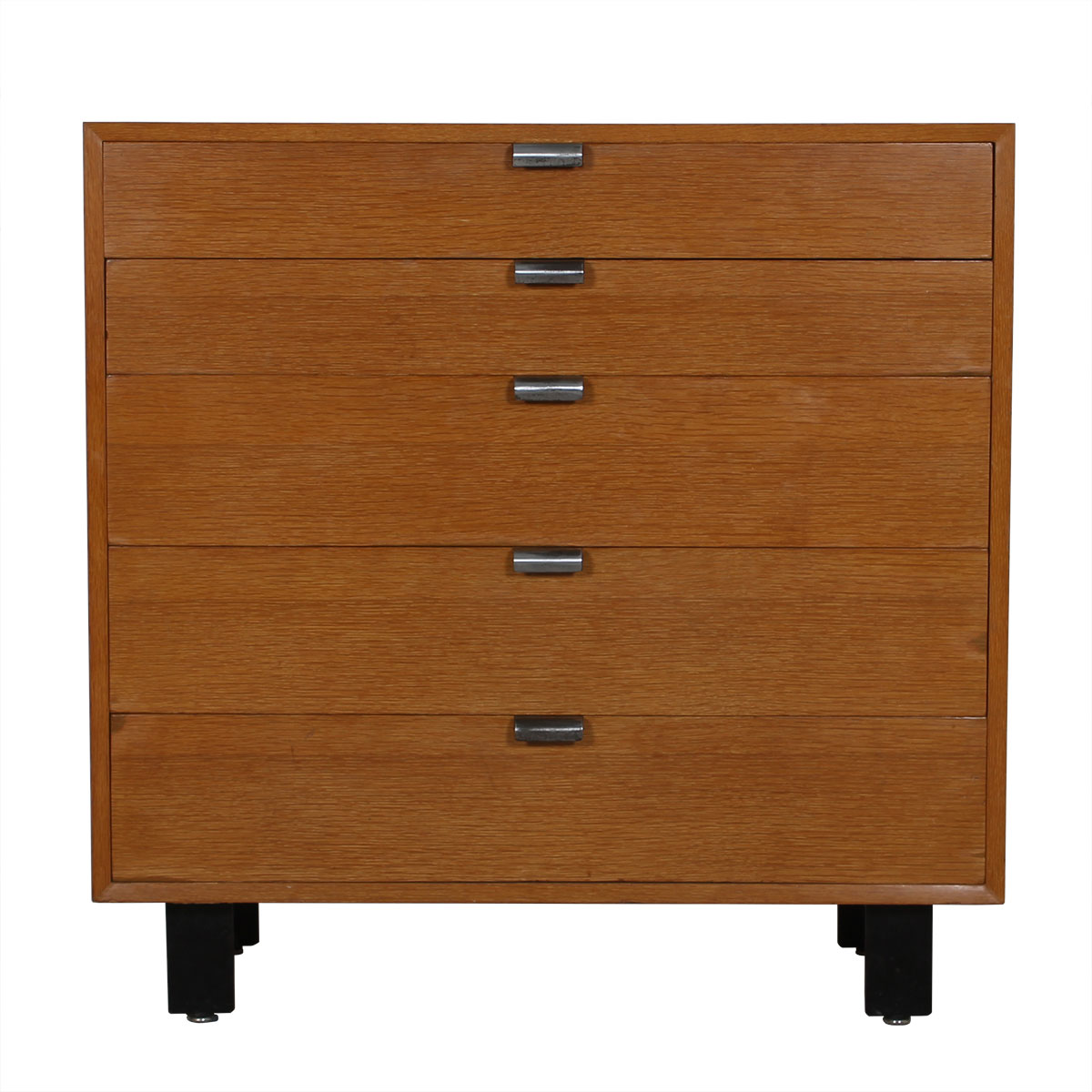 This is a George Nelson for Herman Miller chest of drawers in light walnut. The 5 drawers are graduated, with two having compartments for organization of smaller items. Each drawer has a chrome pull at its center top, and the case sits on ebonized feet.
