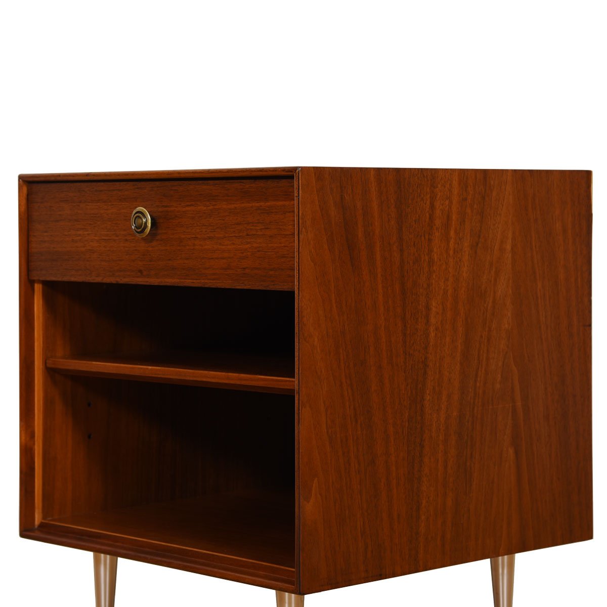 One drawer with a brass knob and a cubby space with one shelf highlight this walnut nightstand by George Nelson for Herman Miller. The legs are tapered brass with small round feet.