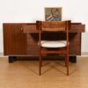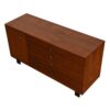 This lovely old walnut dresser by George Nelson for Herman Miller has three long drawers. The top drawer has a fold up mirror so it does double duty as a vanity. A door on the left side conceals cabinet storage. Brass mid-century pulls.