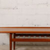 Teak coffee table designed by Grete Jalk for Glostrup Møbelfabrik. This gorgeous coffee table has a floating magazine rack under the tabletop for additional storage. The table itself is a true conversation piece with plenty of history and gorgeous details.