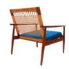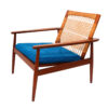 Teak lounge chair with woven cane back by Hans Olsen for Juul Kristensen, Denmark, ca. late 1950s. It can be used with or without a back cushion. This is the chair Don Draper had in his office for a couple of seasons. Chair is in excellent vintage condition with original blue and green-striped fabric on cushions.