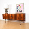 - Rosewood capped chrome legs support the sideboard, which is paired with rosewood accented chrome pulls