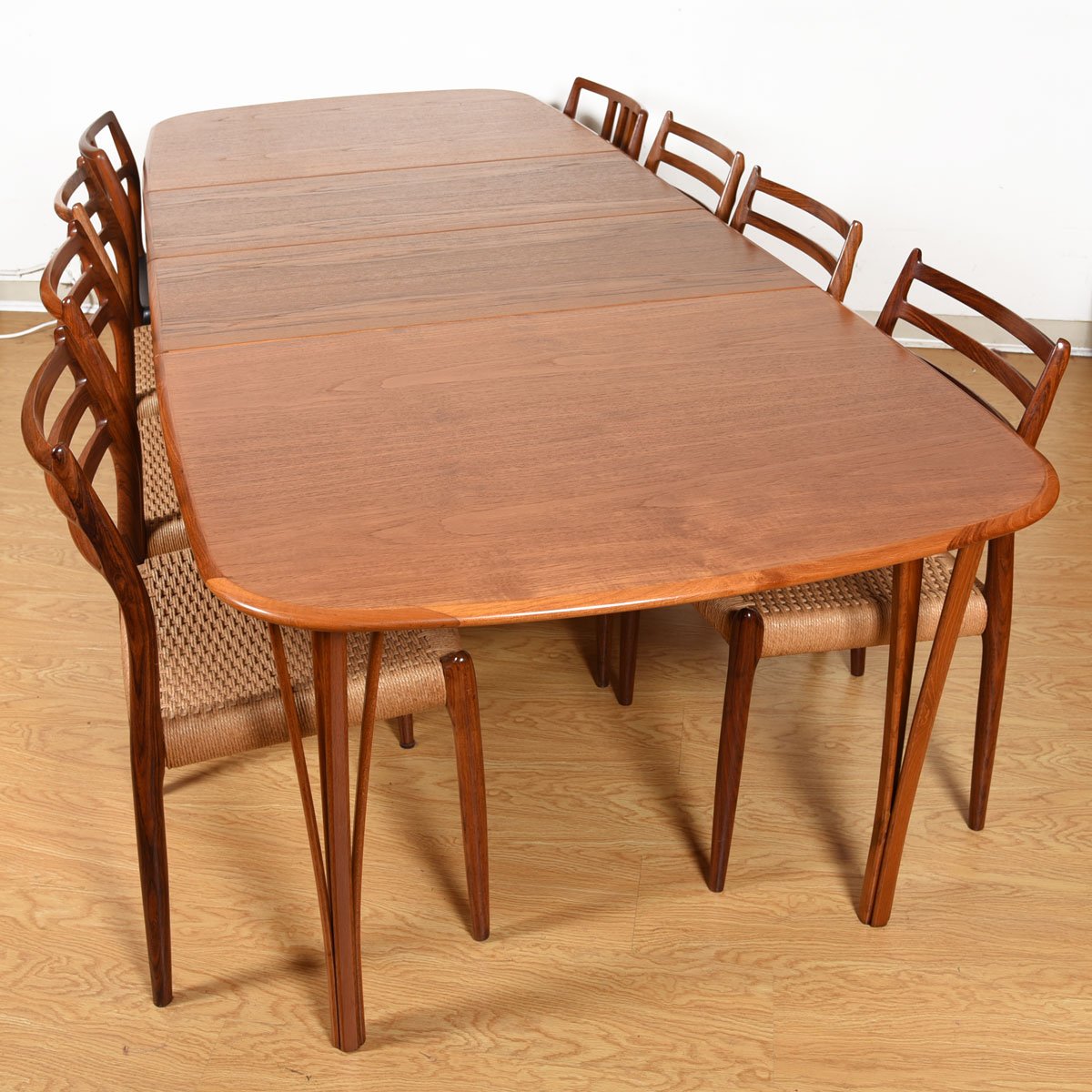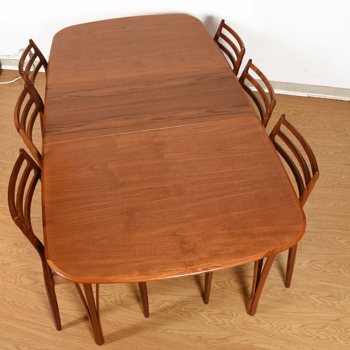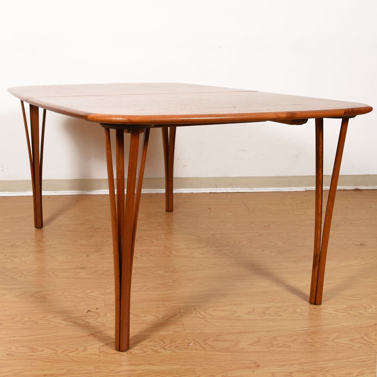 All in all, the general effect is a gracefulness not often seen in a dining table. The graining and patina of the teak is warm and inviting. Nicely sized as-is but expands with the addition of one or two leaves for those times when you need to entertain a crowd.