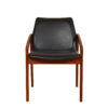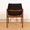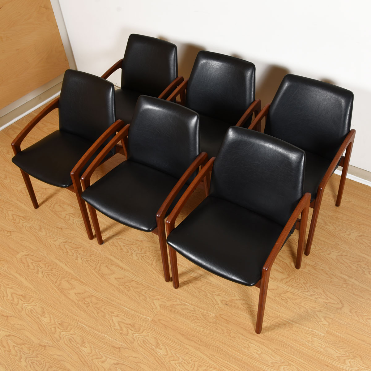 We are pleased to offer this set of 6 stunning dining chairs by Henning Kjaernulf for Korup Stolefabrik. An angled teak frame supports the seat and form the arms for a very sleek and modern look. The chairs are upholstered in a black leatherette.