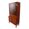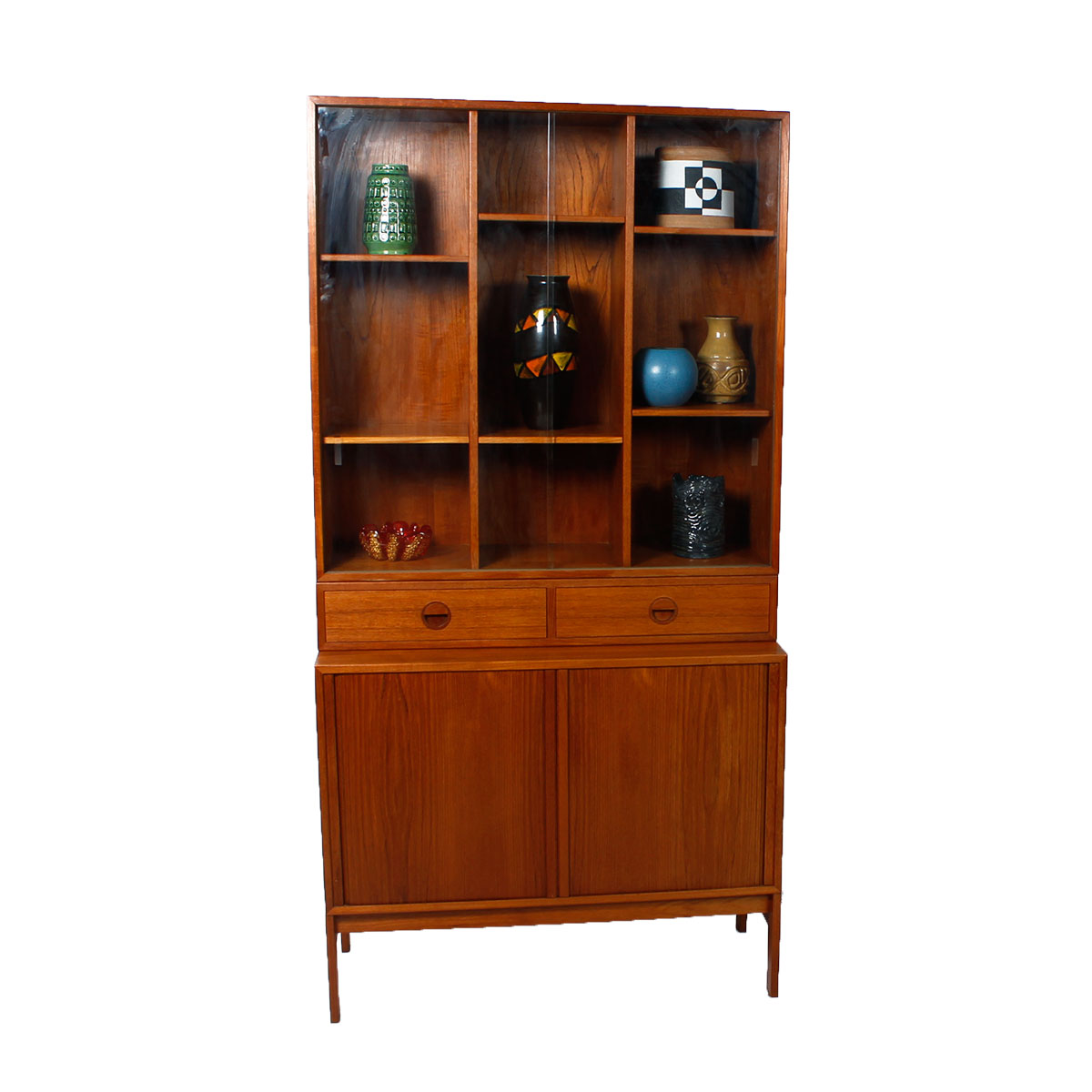 Hansen & Guldborg of Denmark really out-did themselves with this piece! This is truly where form meets function — Statuesque in height but compact in width & depth; it has great form and draws the eye — which is a good thing when you want to display your most prized possessions behind the two sliding glass doors. In addition, there are 2 drawers and even more storage behind the tambour doors. Wow – Great Looking & Practical – What A Wonderful Combination!