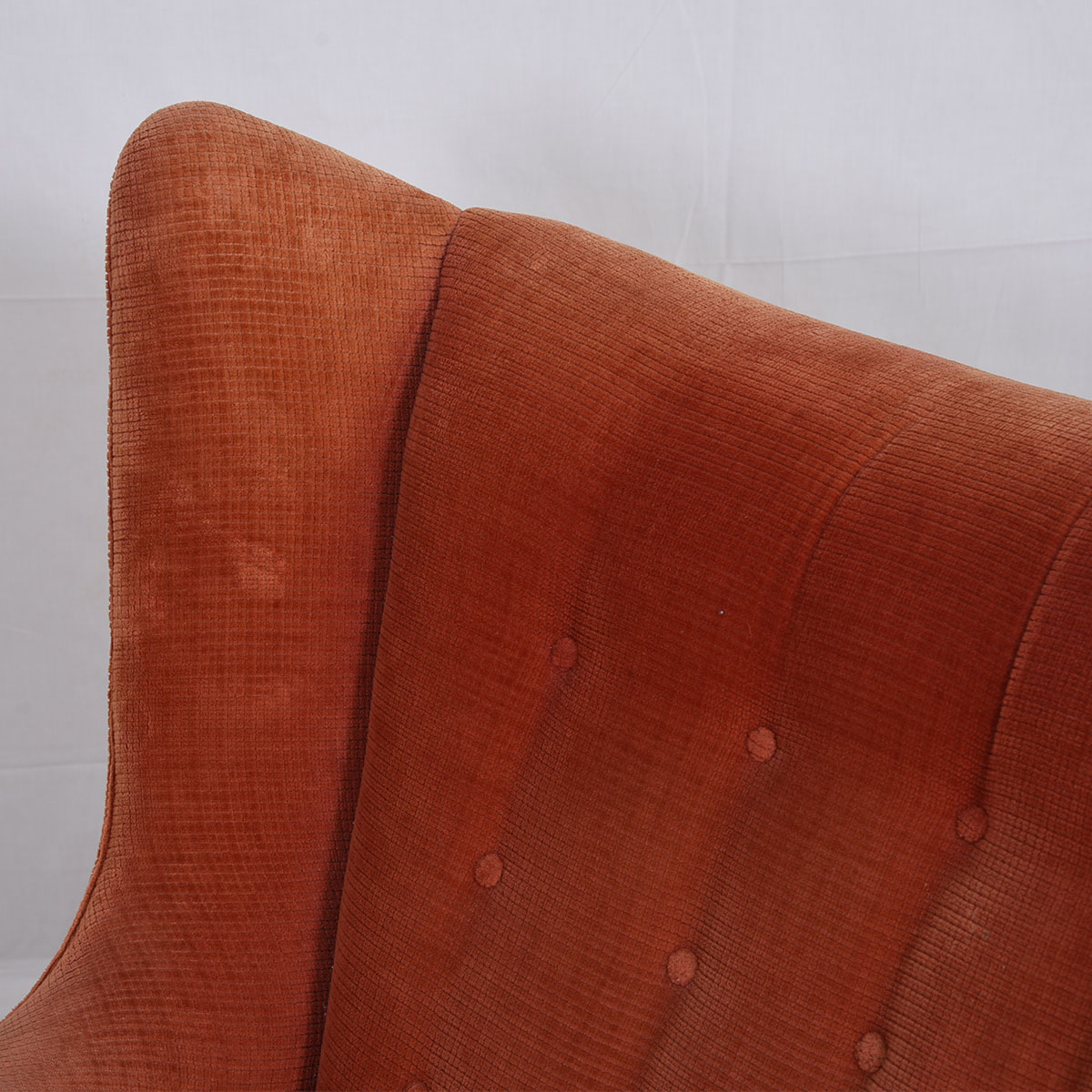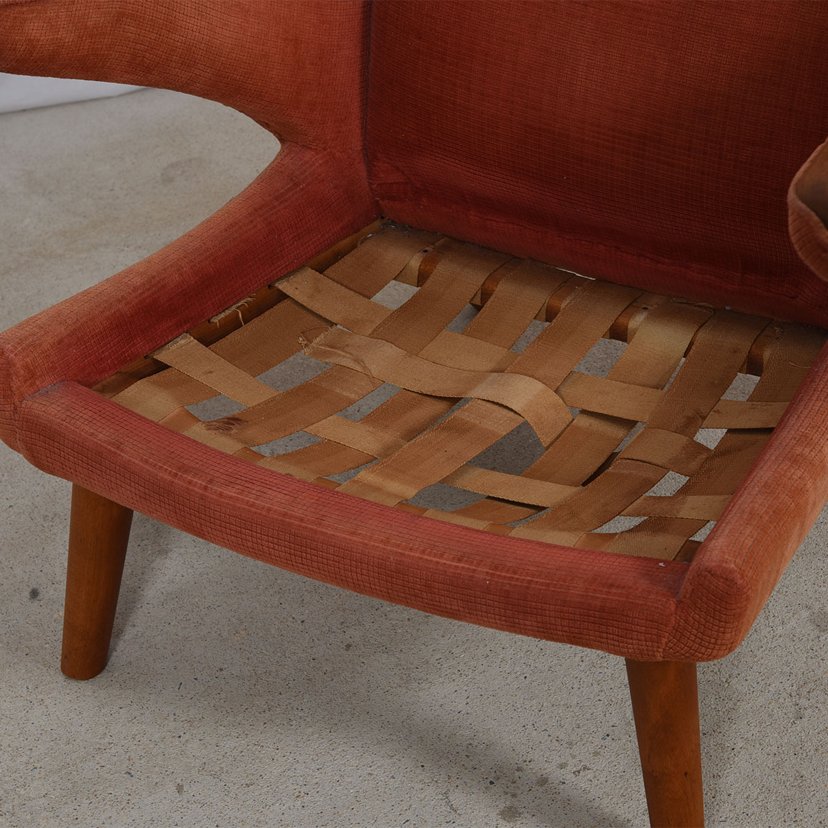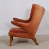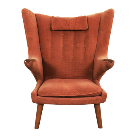 We are pleased to offer this true icon of Danish design, the incredibly comfortable Model AP19 wingback chair by Hans Wagner, more commonly know as the Papa Bear chair. Designed in 1951, this was Wegner’s first collaboration with manufacturer A.P. Stollen. Fully upholstered, it retains its original salmon-colored velveteen upholstery. The legs are believed to be oak and “paws” are teak.