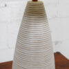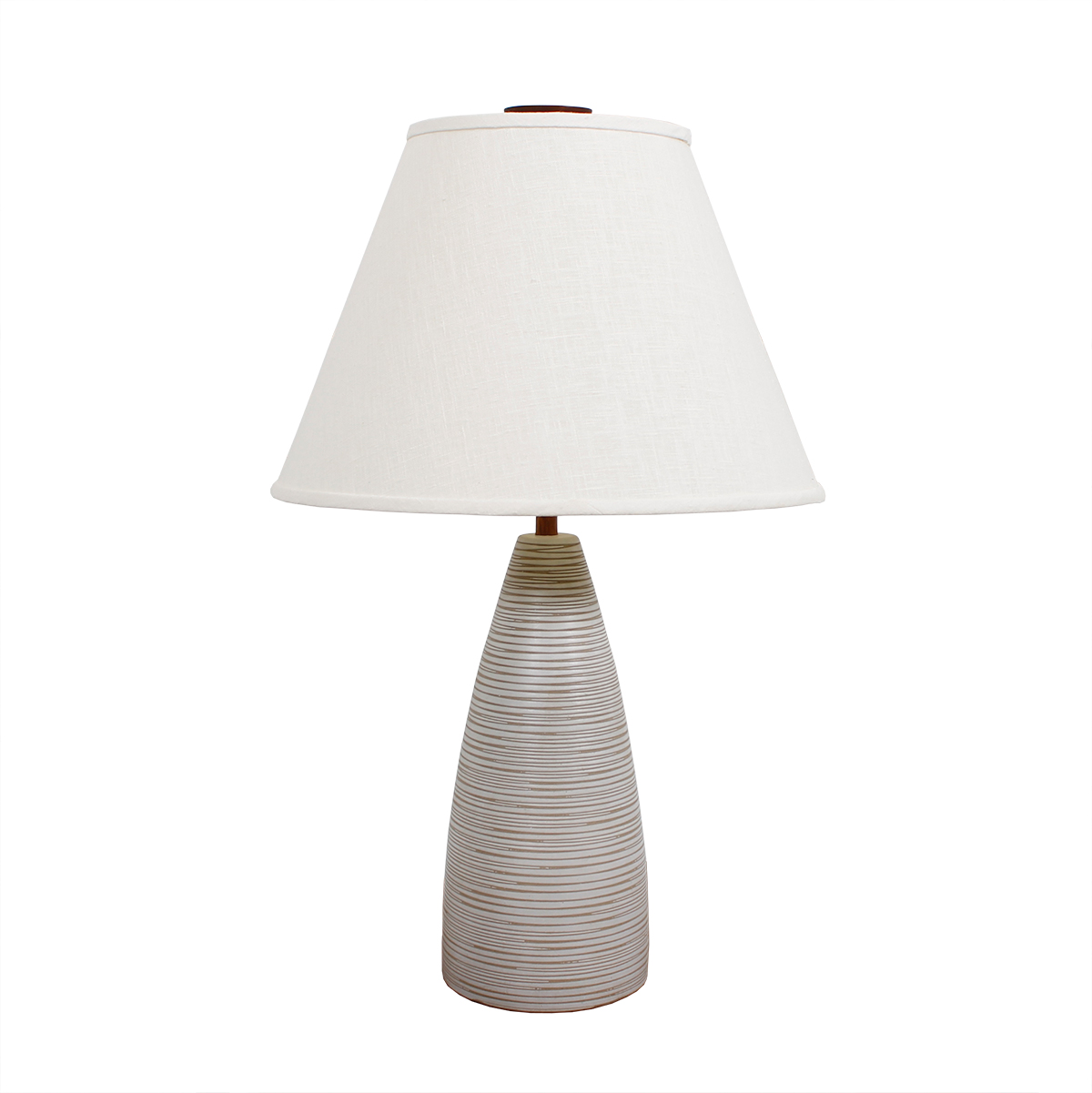 From the pottery studio of Jane & Gordon Martz comes this conical-shaped lamp. It is grayish white into which sgraffito lines have been incised around the entire shape. It is a very effective design giving the piece lots of movement. The lamp retains its original finial, the hallmark of a Martz / Marshall Studios lamp, and also has been signed on the base near the cord.