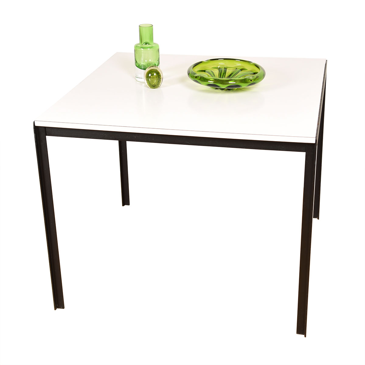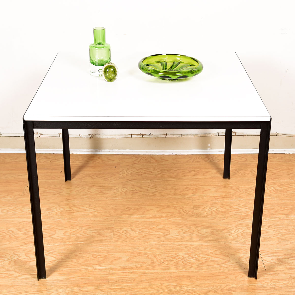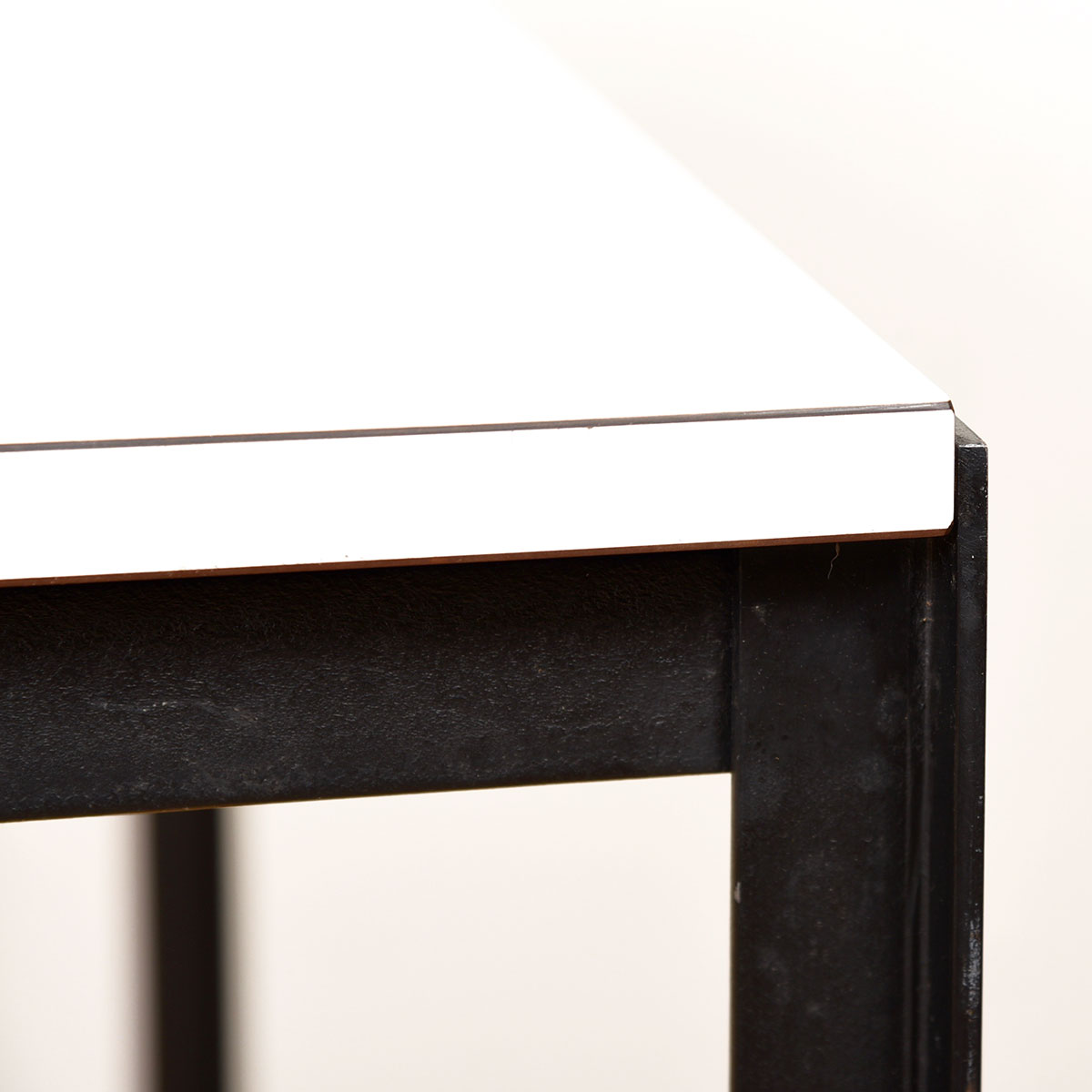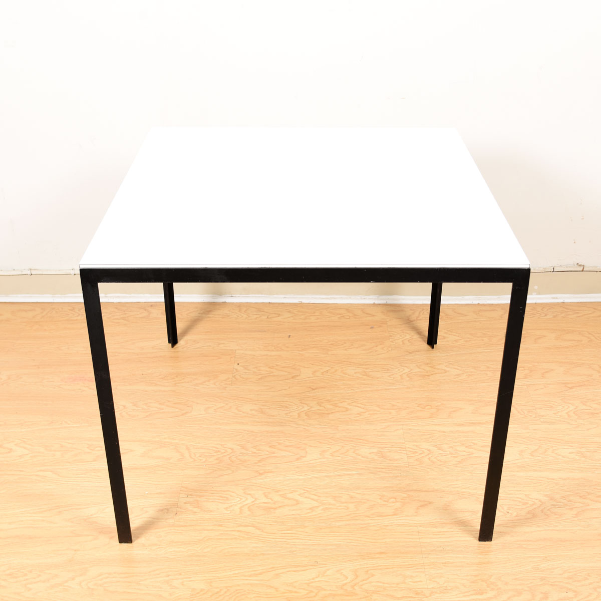 This 1960’s vintage T-Angle table from Knoll features a square top of white laminate and black iron legs.