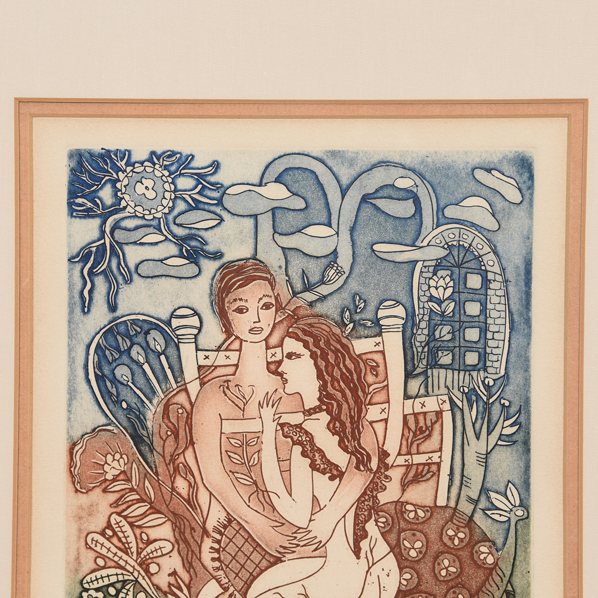 This signed mid-century screen print titled “Le Temps d’Aimer” (A Time for Love) features two lovers in an idyllic garden setting. Perhaps Adam and Eve..or Eve and Eve, in the garden of Eden.