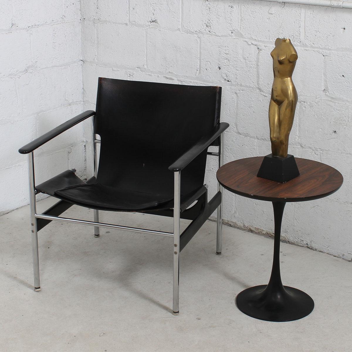 Designed in 1960 by Charles Pollack for Knoll, the steel and leather ‘sling chair’ or ‘657’, as it is commonly called, offers a refined combination of materials and finishes. Tubular steel legs connect to cast-aluminum arms and stretchers with exposed hardware, exemplifying Pollock’s simple design approach.
