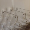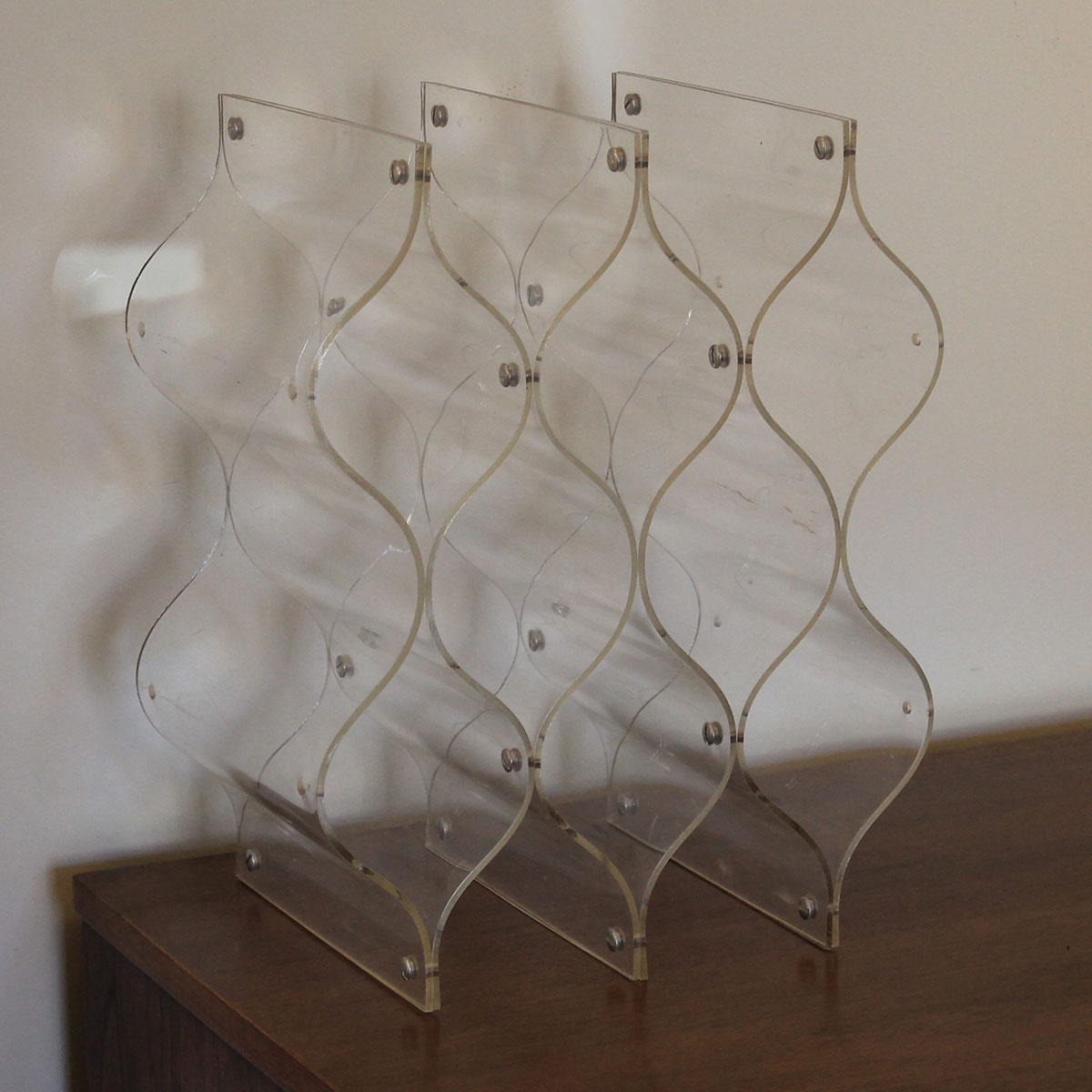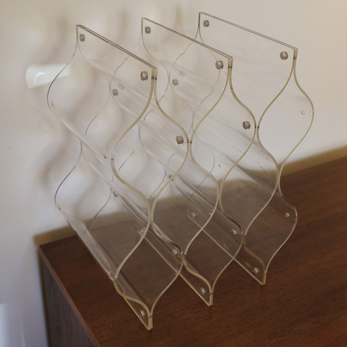 High design in this wine rack fabricated of lucite. Can be oriented horizontally or vertically & hold up to eight bottles within its curvaceous molded layers. Labels are easily readable with the bottles appearing to float in the air. Very beautiful and unique vintage piece.
