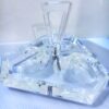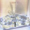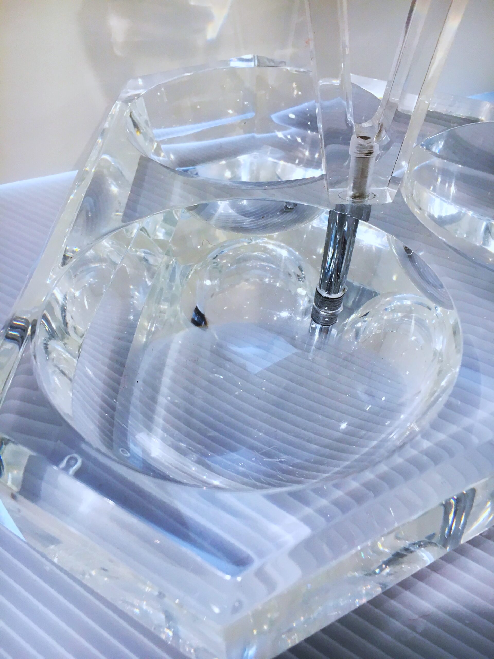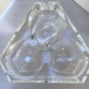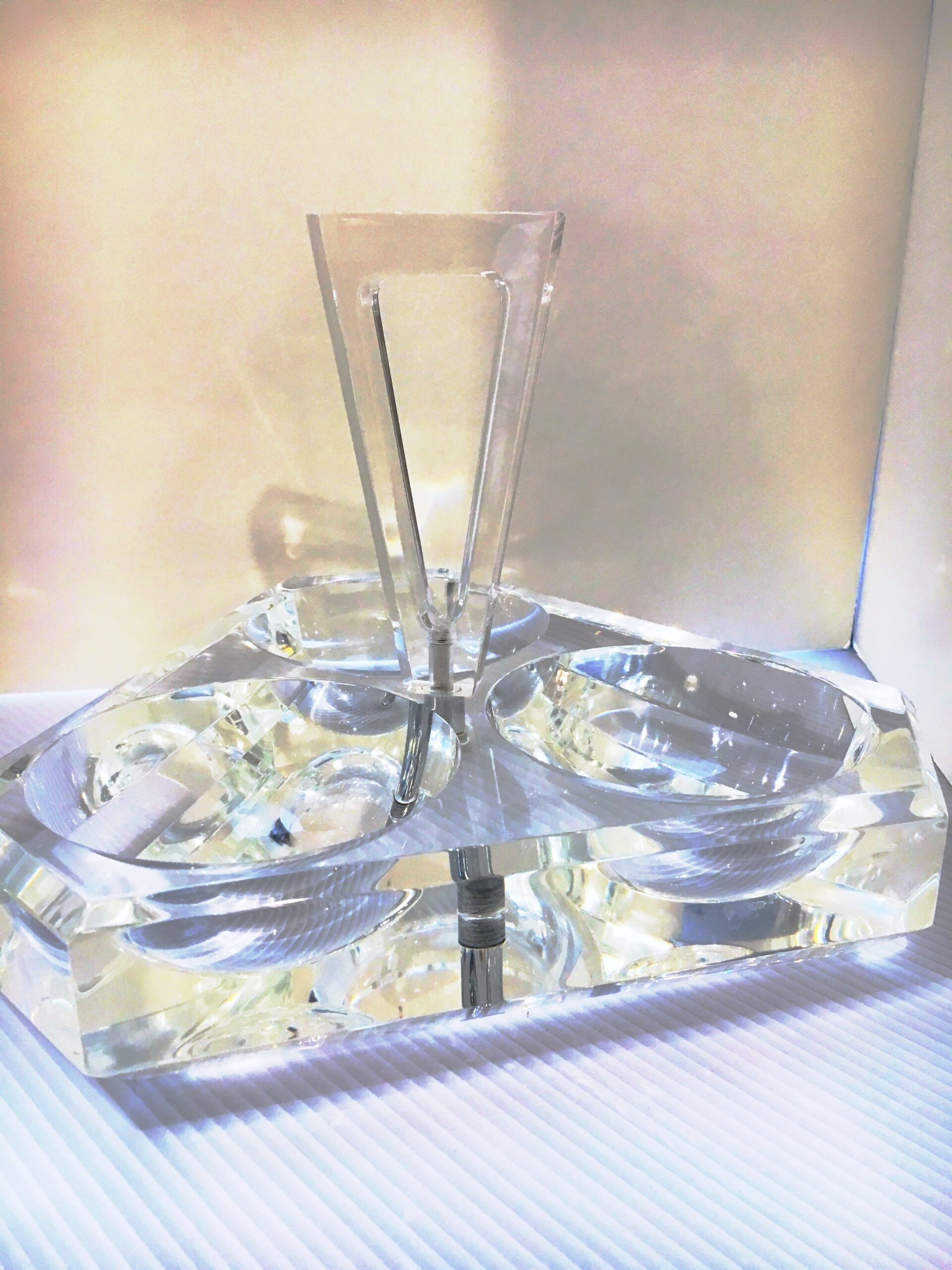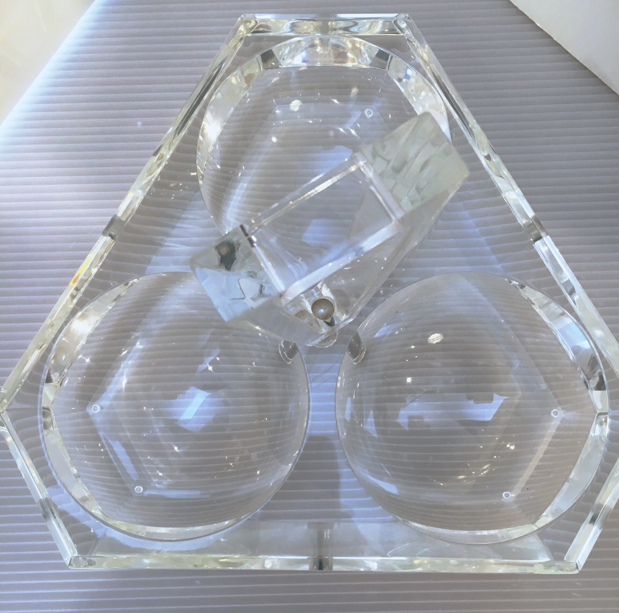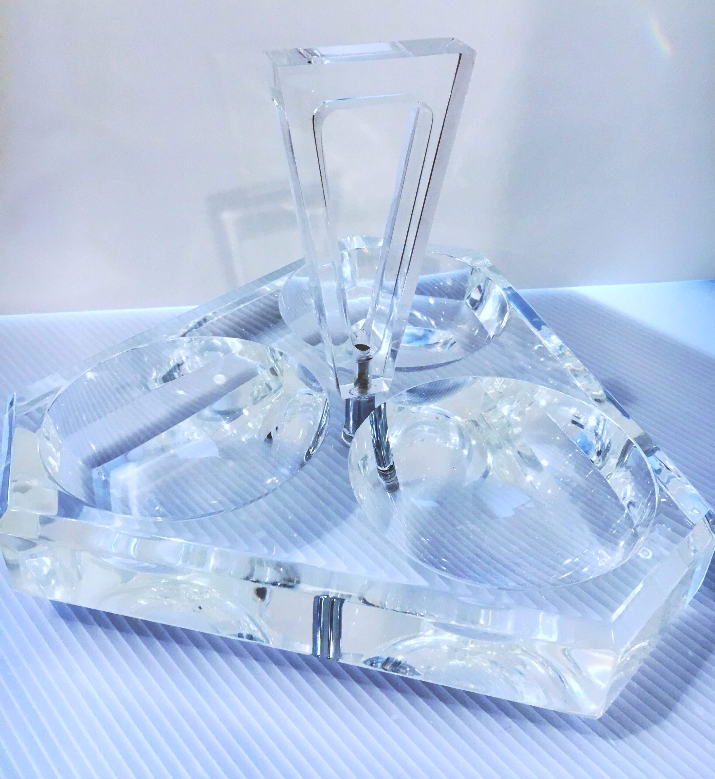Fabulous ’70s Lucite serving “tray” for nuts, candy, etc. Triangular in form, it has three circular bowls in each clipped point. A carrying Handle makes it über functional. Very heavy and in excellent condition. Great style.