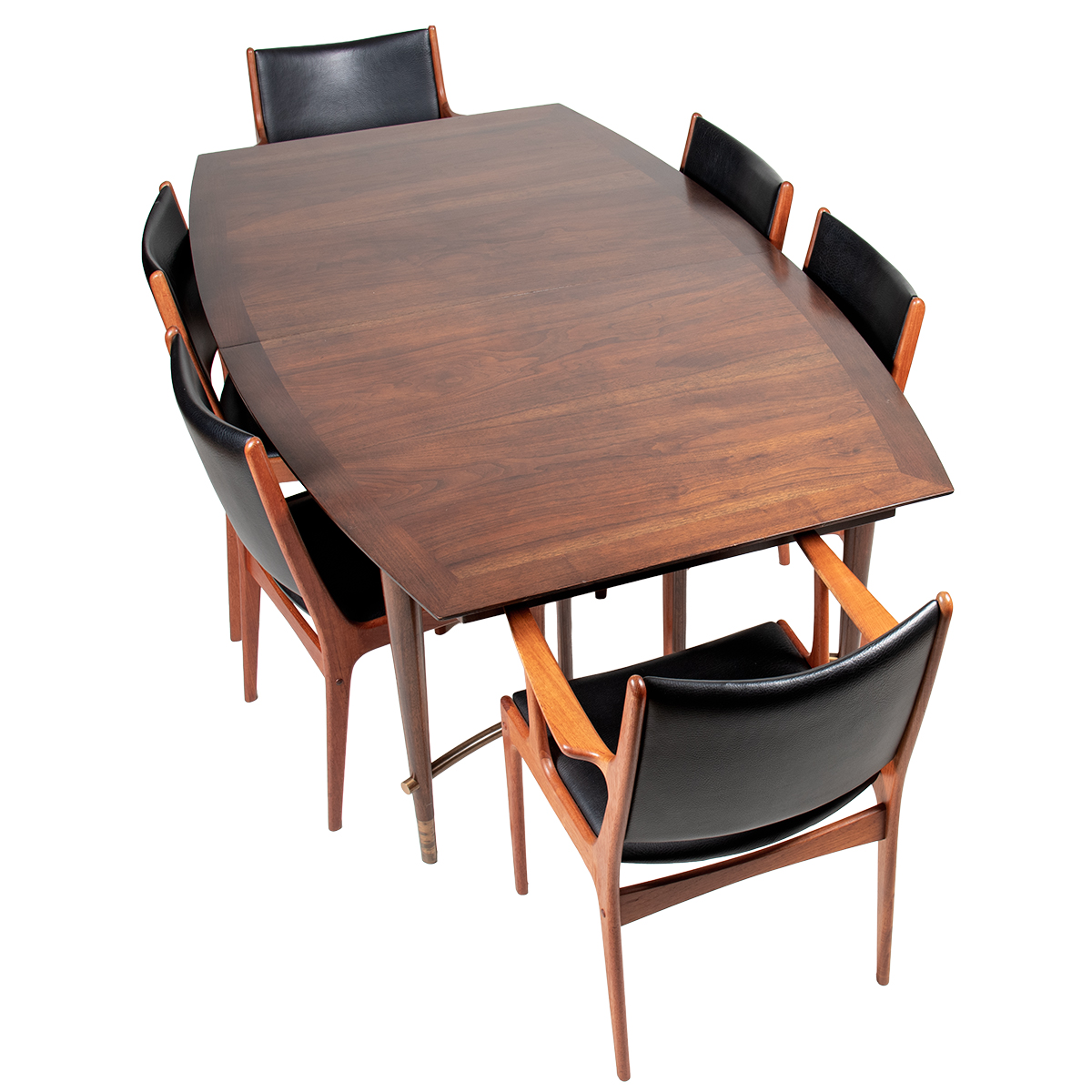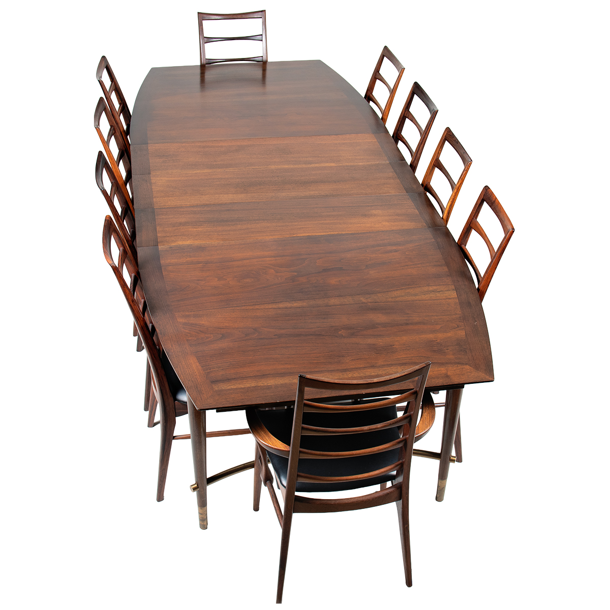 To arrange purchase or for more information about the Magnificent American Modernist Designer Walnut Expanding Dining Table w Brass Leg Accents please call us at 202.882.1648 or email us at info@modernmobler.com