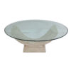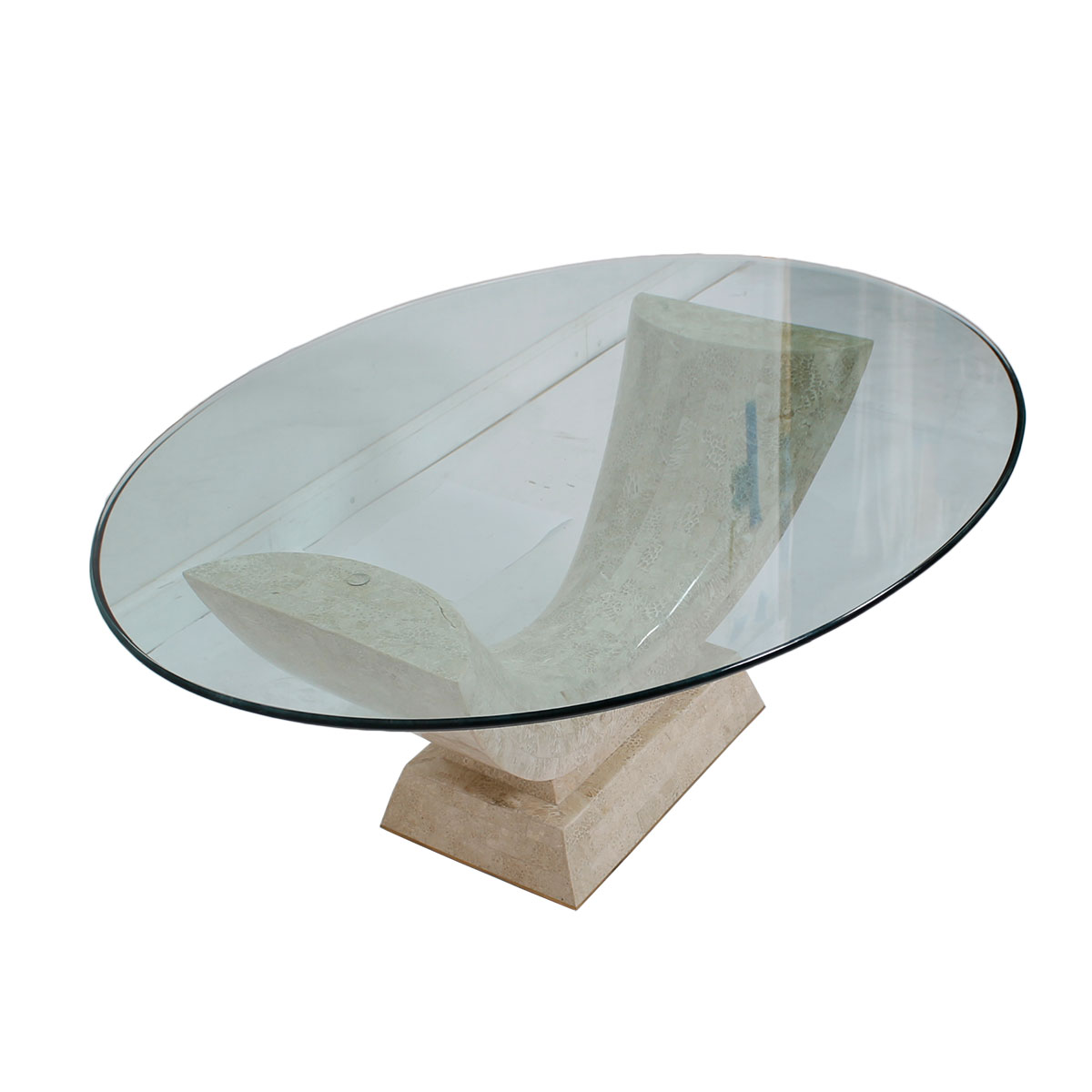 Big style in a smaller coffee table! Attributed to Maitland Smith, this oval glass top coffee table has a tessellated stone base in a reverse arch shape. It’s in excellent vintage condition.