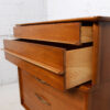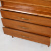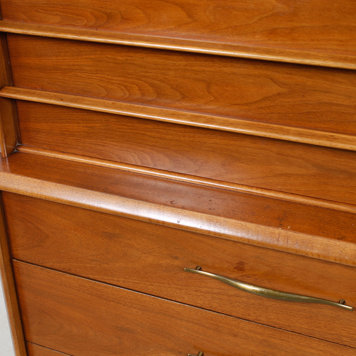 Handsome MCM tall dresser from the well-respected manufacturer Kent Coffey. In walnut, the piece has a solid, linear feel with the drawers being divided into two sections. The top section, slightly recessed from the lower half, has two drawers with interesting sculptural handles. The lower portion has three drawers with long brass handles that add dimension. The dresser sits on a recessed frame with tapered legs. They don’t craft furniture this solid anymore.