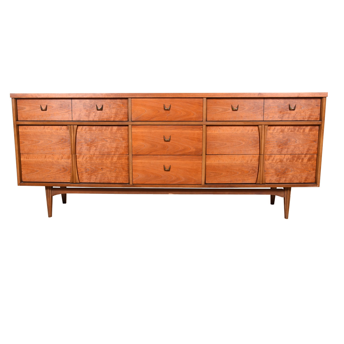 Long Mid-Century Modern Walnut 9-Drawer Dresser with Brass & Sculptural Pulls