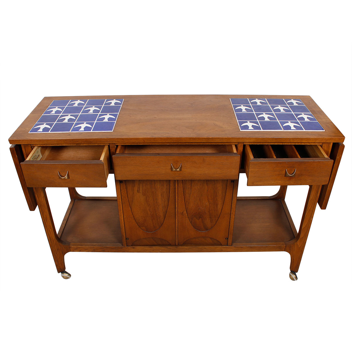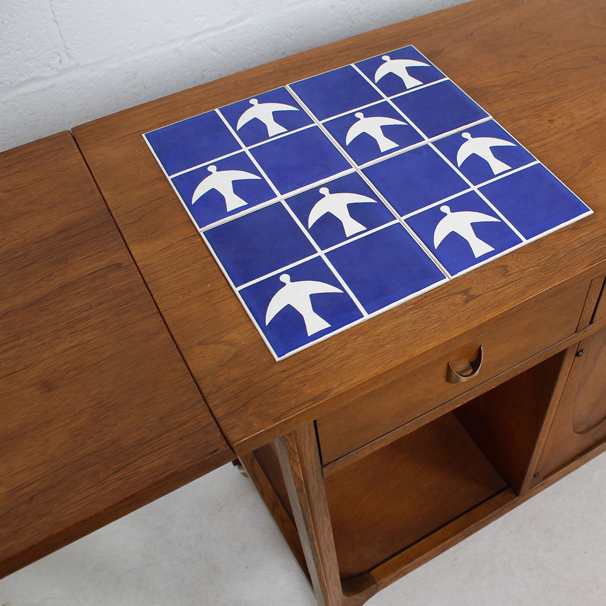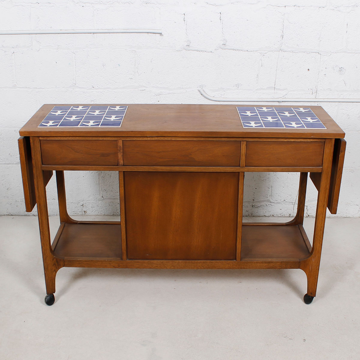 Beautiful Royal Blue Tiles atop this walnut piece with flip-up expanding sides. Finished on all sides. Wheel this piece, from America’s most popular line of walnut furniture in the 60’s, to serve & impress your guests!