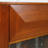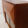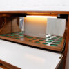 The predominant design feature is the three-dimensional diamond on the drop down door at the top. When opened, it extends to exhibit a shelf where glasses are to be kept. This area is lighted and has a mirrored back. Beneath is a glass-fronted cubby. Adjustable shelved cabinet space is on the left behind a door. On this piece the doors pop open when given a gentle push.