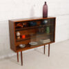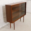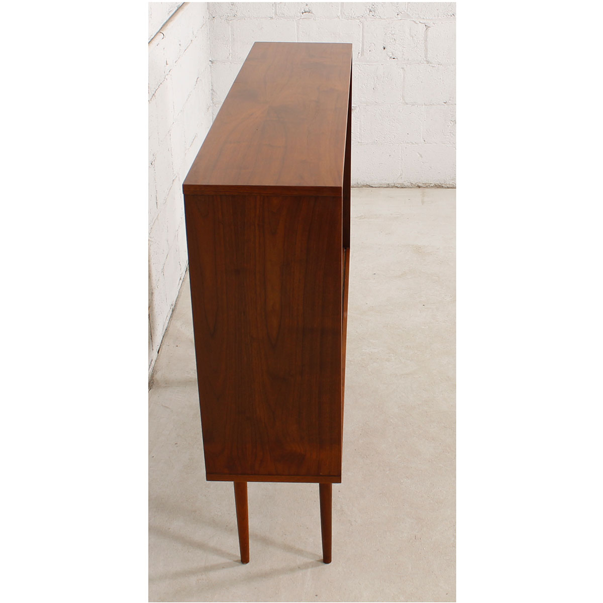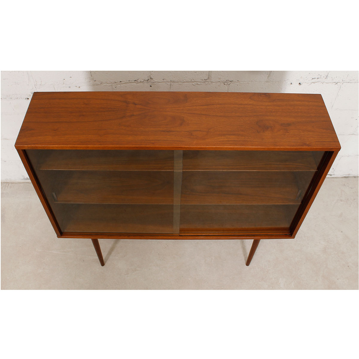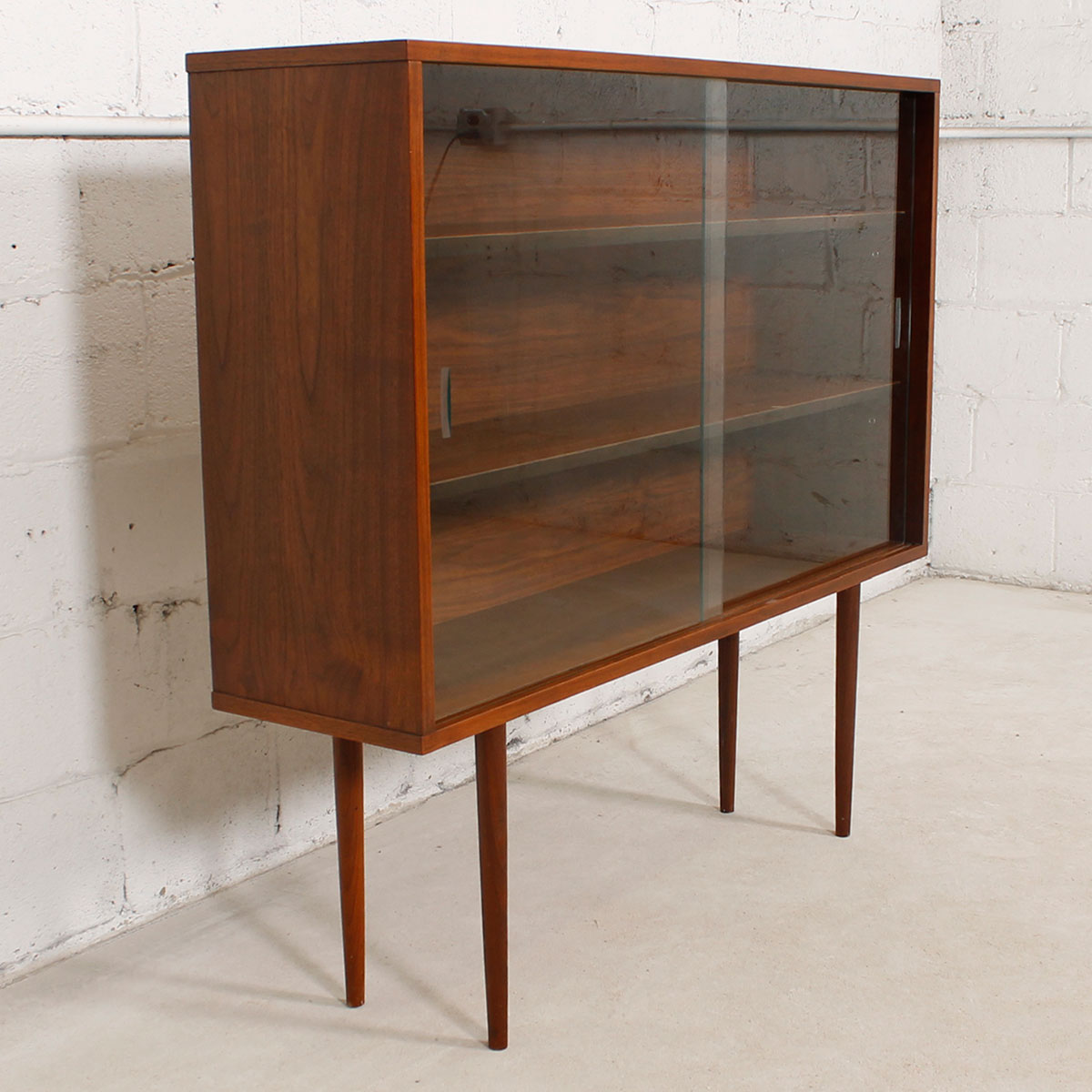 Thin 1950s Walnut Display Cabinet w/ Glass Doors & Adjustable Shelves