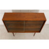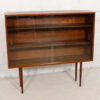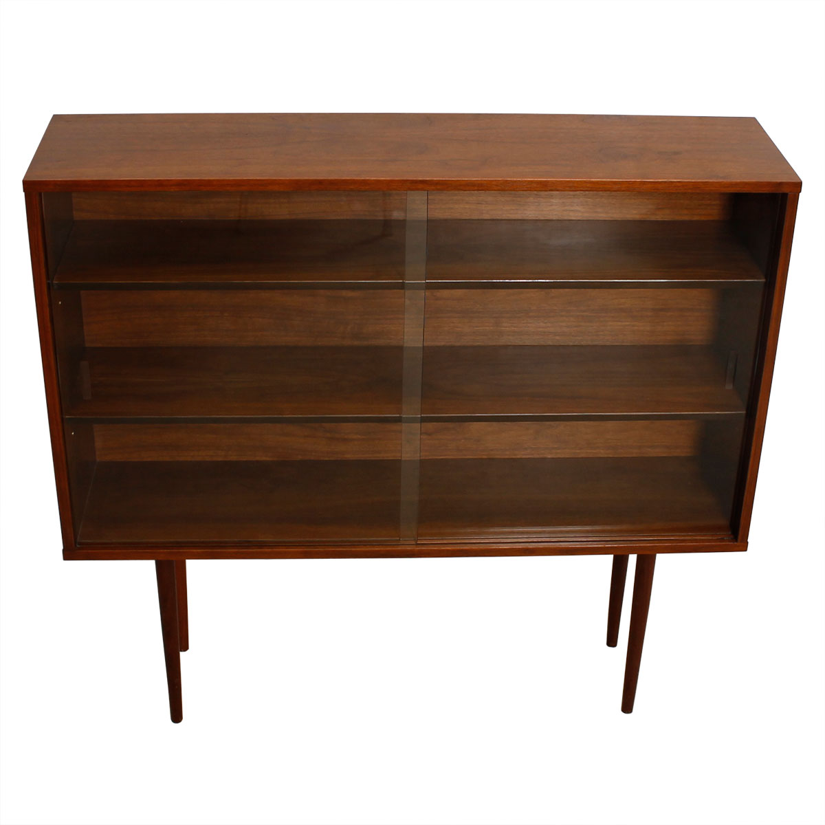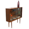 Slim and leggy describe this walnut display cabinet dating to the 1950’s. The walnut has aged to a beautiful golden patina. Glass doors with incised pulls showcase your prized possessions yet keep them dust-free. The slender case sits on tall turned legs for a definite mid century modern look. Both shelves are adjustable.