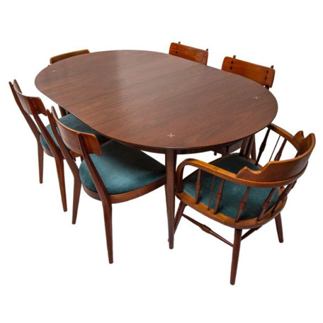 Design Attributed to Merton Gershun/ George Nelson. Comes with two 12″ Leaves to Expand the Table From Round-to-Oval Configuration. Sculpted tapering legs, and American of Martinsville’s signature Aluminum “X” Metal Inlays. As Always, Plenty of Chairs to Choose From!