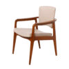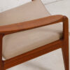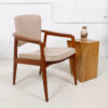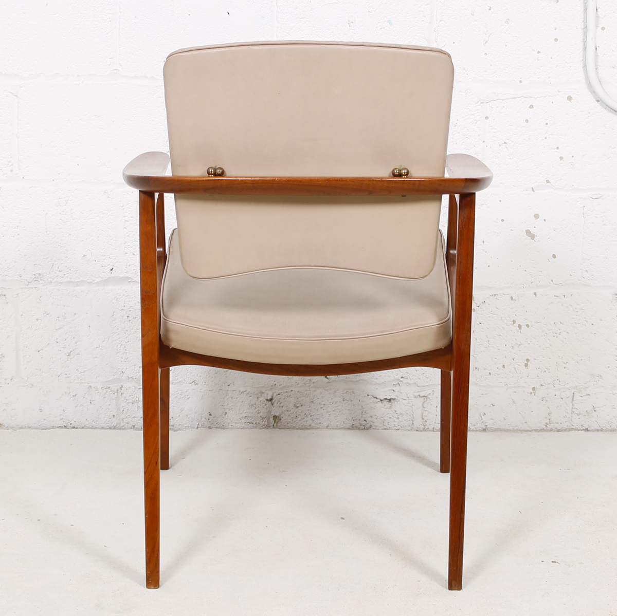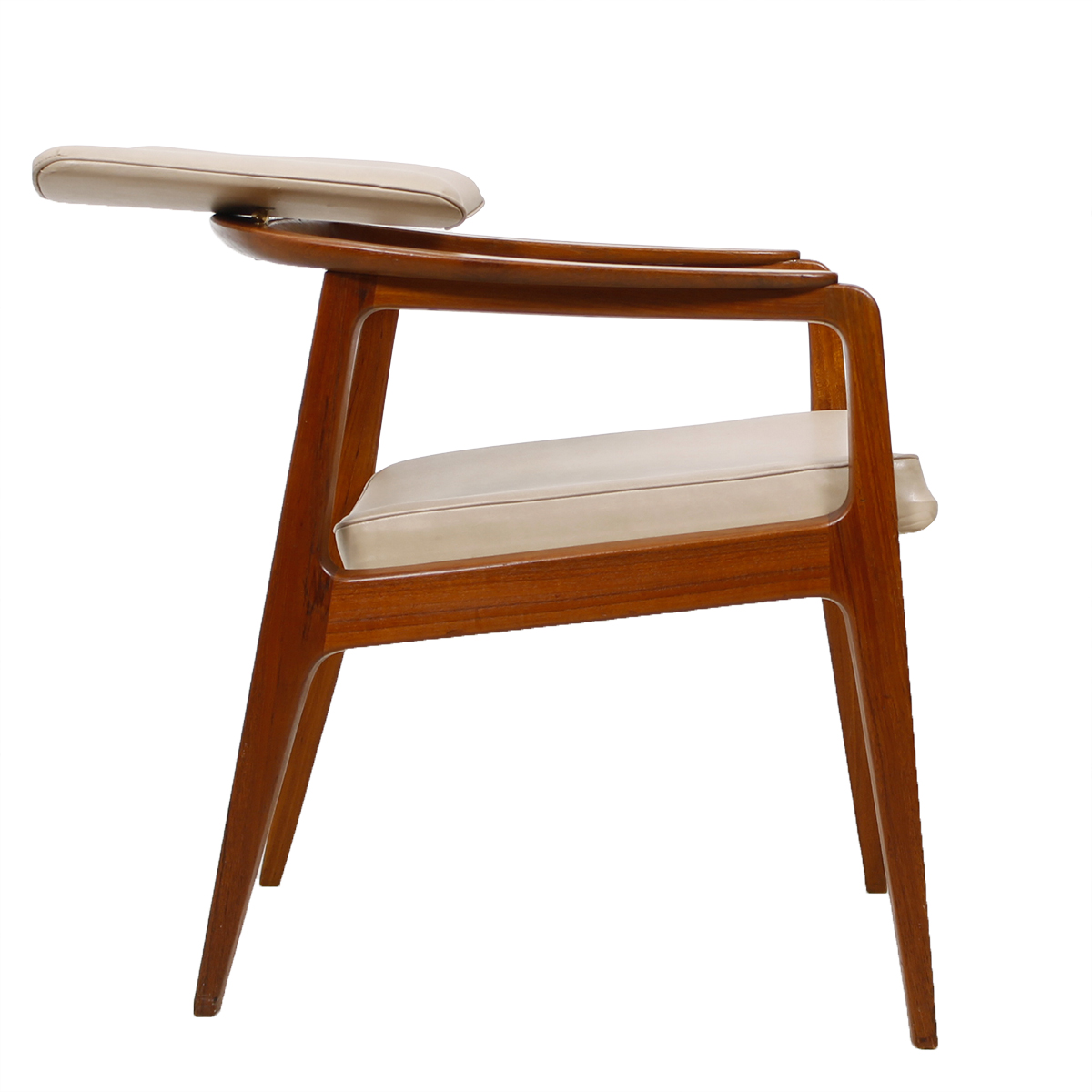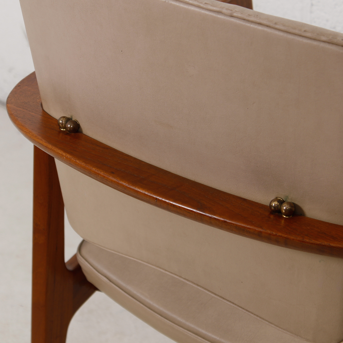 This gorgeous MCM pivot-back accent chair is Danish teak and was imported by John Stuart, New York, circa 1960’s. The back and seat are upholstered in its original mushroom beige Naugahyde. Viewed from the side, the chair appears to have a straight back however once you sit down you discover that it adjusts to your comfort. It is also from the side that you see the beautiful lines of the legs, which thrust forward and backward from the squared frame of the arms. The seat slopes back, also visible through the side of the frame.