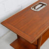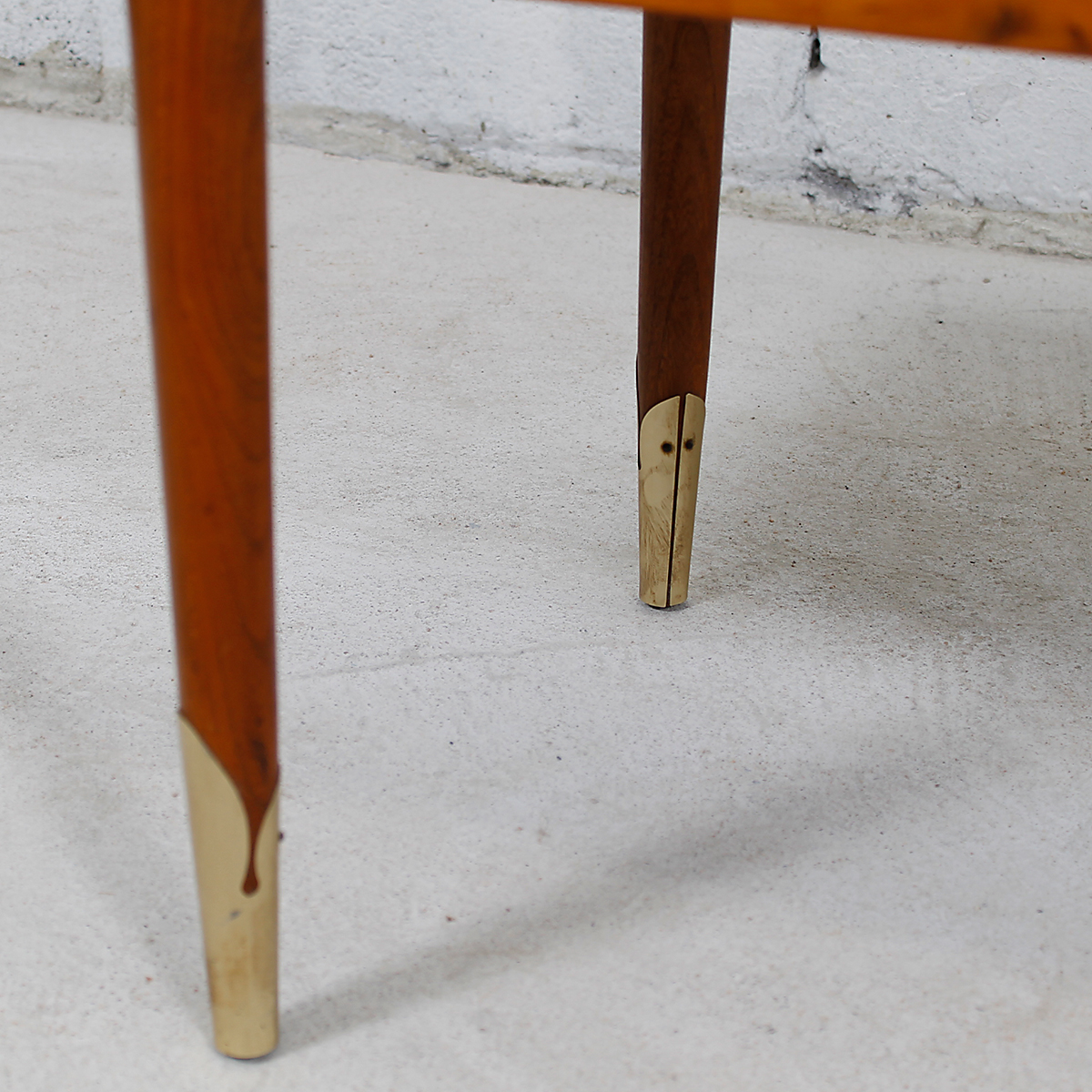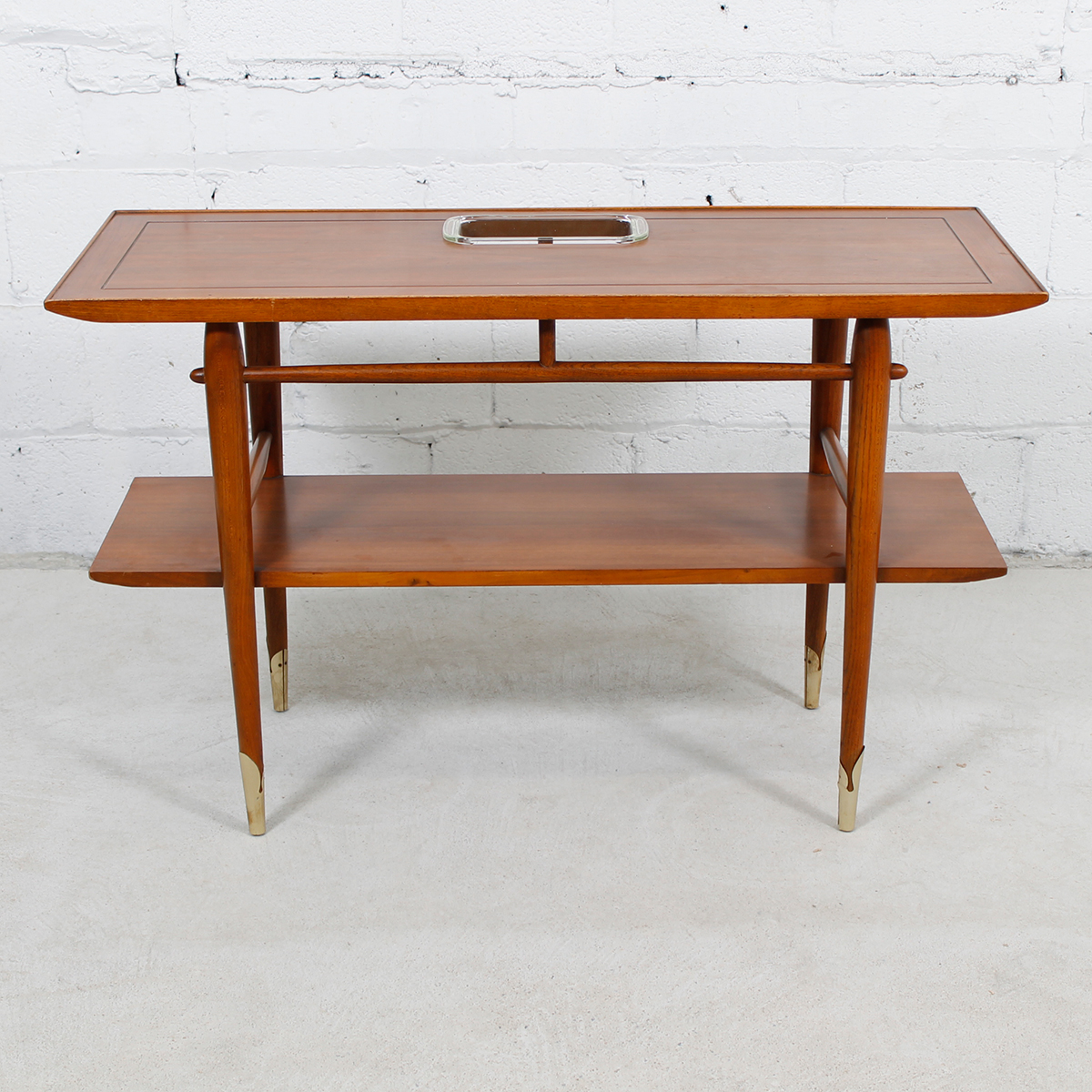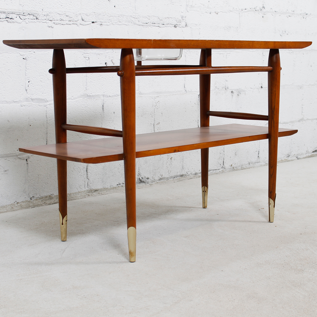 This interesting MCM console table has two shelves, the top of which has a glass insert which can be used to hold plants. The shelves are supported by struts and legs which become part of the dynamic design. The nicely-sized table would be great behind a sofa, in an entryway or as a supplemental serving area in the dining room. The walnut has aged to rich, warm tones of brown and each leg has an interesting sleeve that adds to the charm of the entire piece.